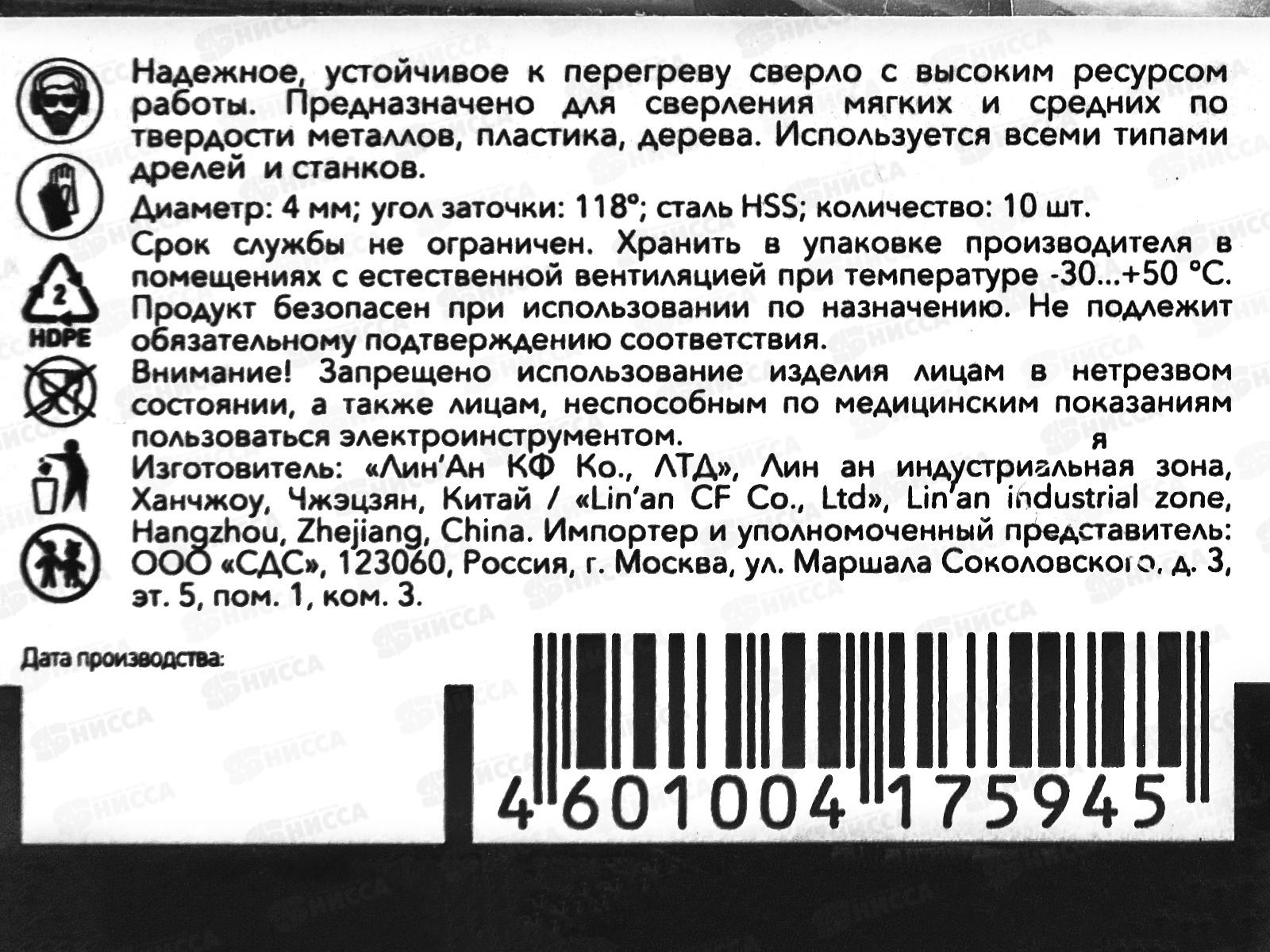 Сверло по металлу 4,0*75*43мм HSS 10шт DIN 338 Kranz KR-91-0614