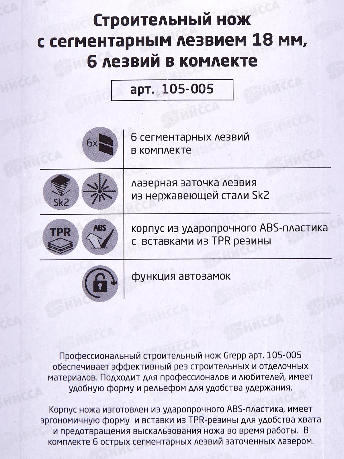 Нож строительный с лезвием трапеция 6запасных лезвий 105-005 *12/72