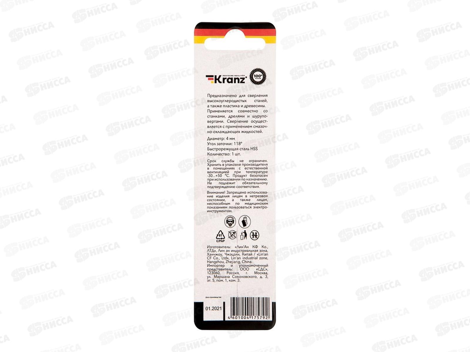 Сверло по металлу 4,0х75х43мм (HSS), DIN 338, 1 шт. в упаковке KRANZ, KR-91-0560