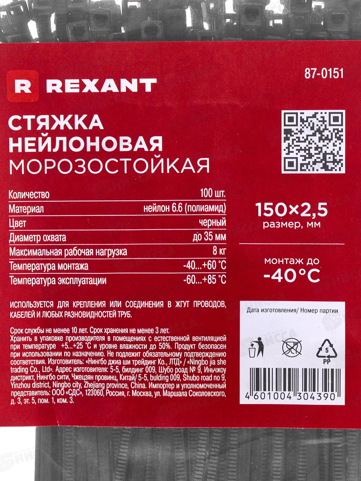 Стяжка нейлоновая морозостойкая 150*2,5мм, черная 100шт, REXANT, 87-0151