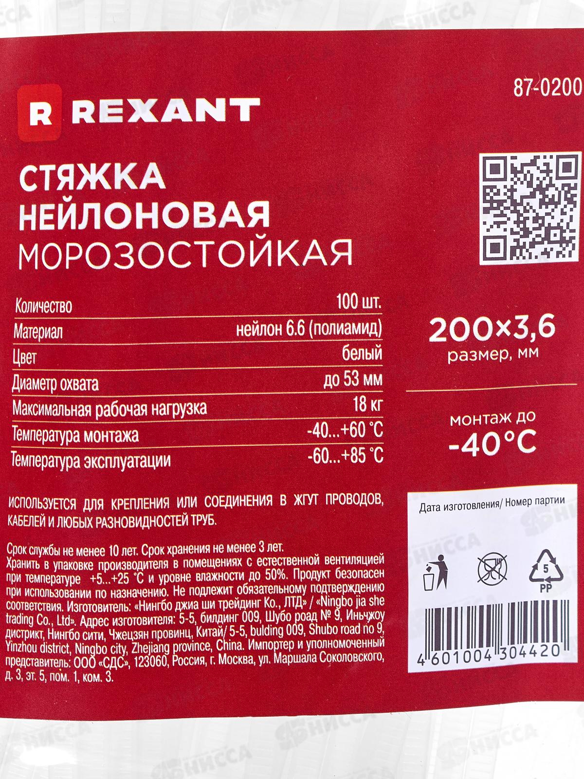 Стяжка нейлоновая морозостойкая 200*3,6мм, белая 100шт, REXANT, 87-0200