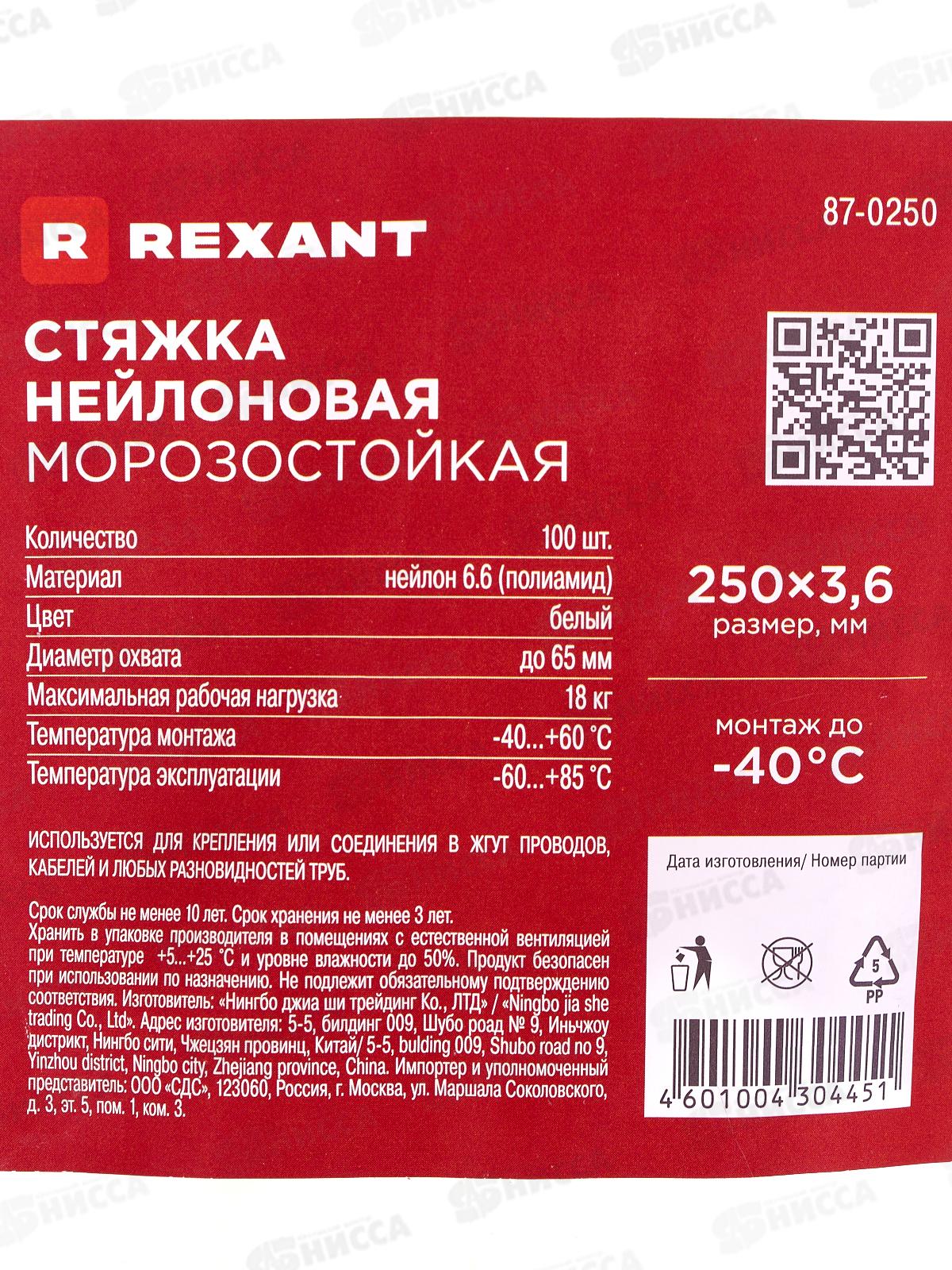 Стяжка нейлоновая морозостойкая 250*3,6мм, белая 100шт, REXANT, 87-0250