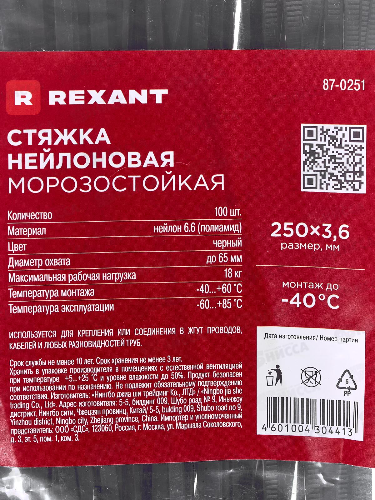 Стяжка нейлоновая морозостойкая 250*3,6мм, черная 100шт, REXANT, 87-0251