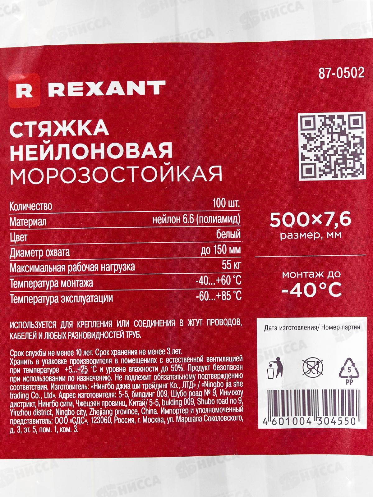 Стяжка нейлоновая морозостойкая 500*7,6мм, белая 100шт, REXANT, 87-0502