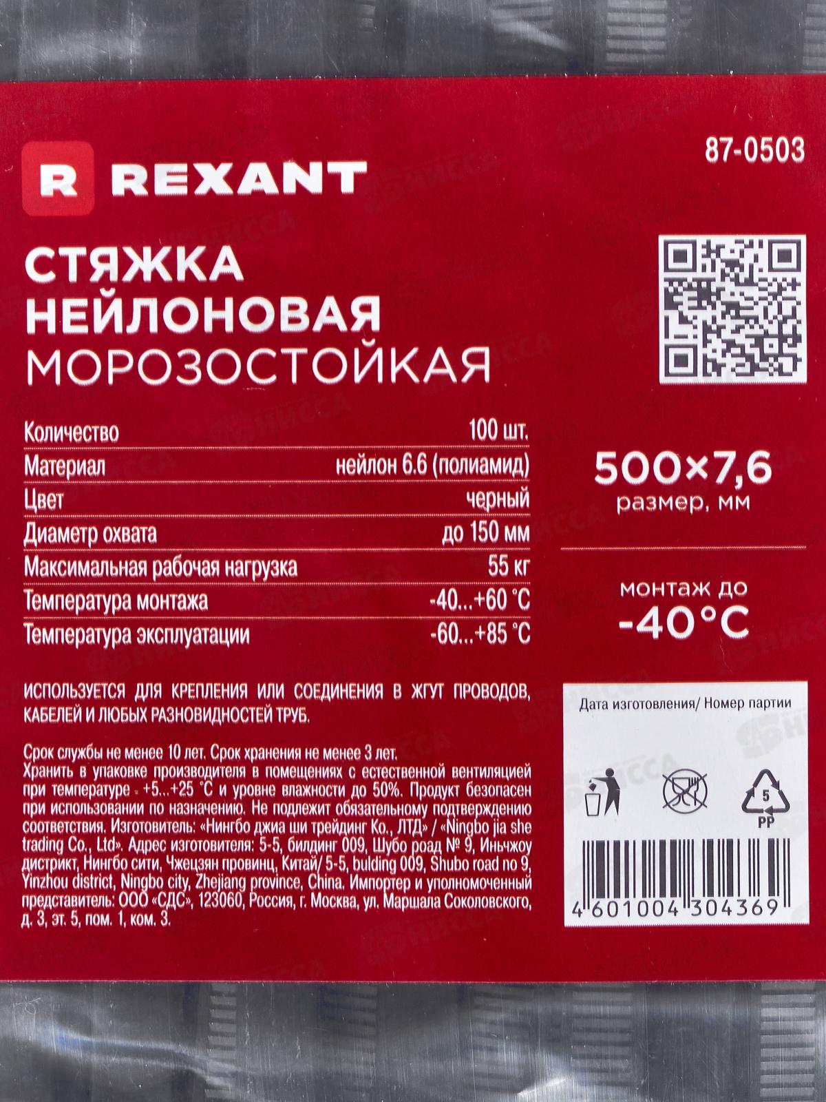 Стяжка нейлоновая морозостойкая 500*7,6мм, черная 100шт, REXANT, 87-0503