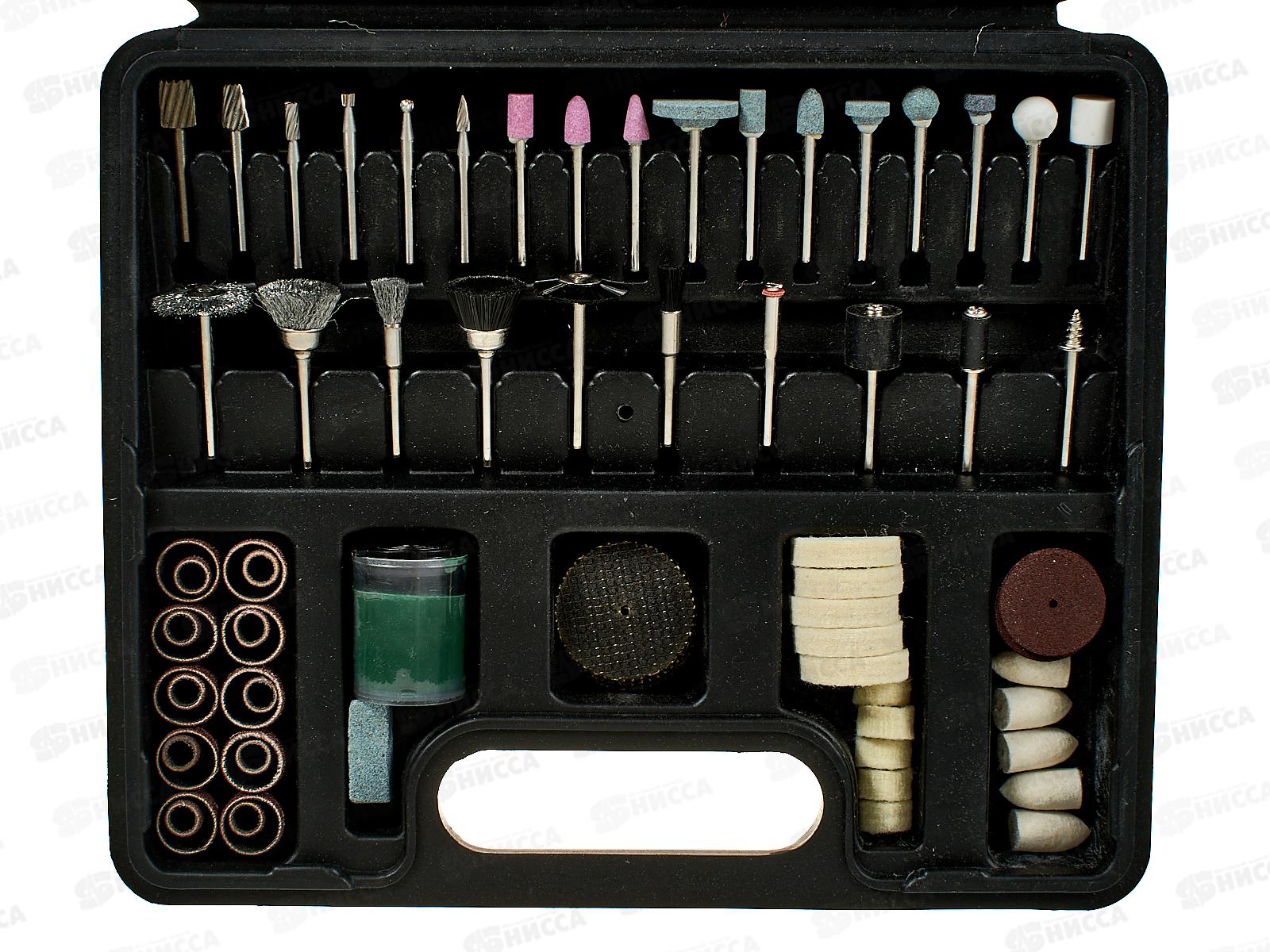 Набор гравировальных насадок предназначен для работы с различными материалами. С их помощью можно гравировать, сверлить отверстия, полировать, зачищать и шлифовать поверхности. В комплект входит: вал с винтом (для использования отрезных дисков) -1 шт; вал с резьбой (для использования полировальных насадок) - 1 шт; вал с барабаном 6,3 мм - 1 шт; вал с барабаном 13 мм - 1 шт; шлифовальная лента 6,3 мм - 10 шт; шлифовальная лента 13 мм - 10 шт; канифольный отрезной диск - 10 шт; отрезной диск абразивный - 26 шт; паста ГОИ - 1 шт; правочный камень - 1 шт; войлочная полировальная насадка цилиндр - 5 шт; войлочный полировальный круг 13 мм - 5 шт; войлочный полировальный круг 24 мм - 5 шт; шлифовальная насадка - 11 шт; щетка металлическая - 3 шт; щетка жесткая - 3 шт; фреза металлическая - 6 шт.