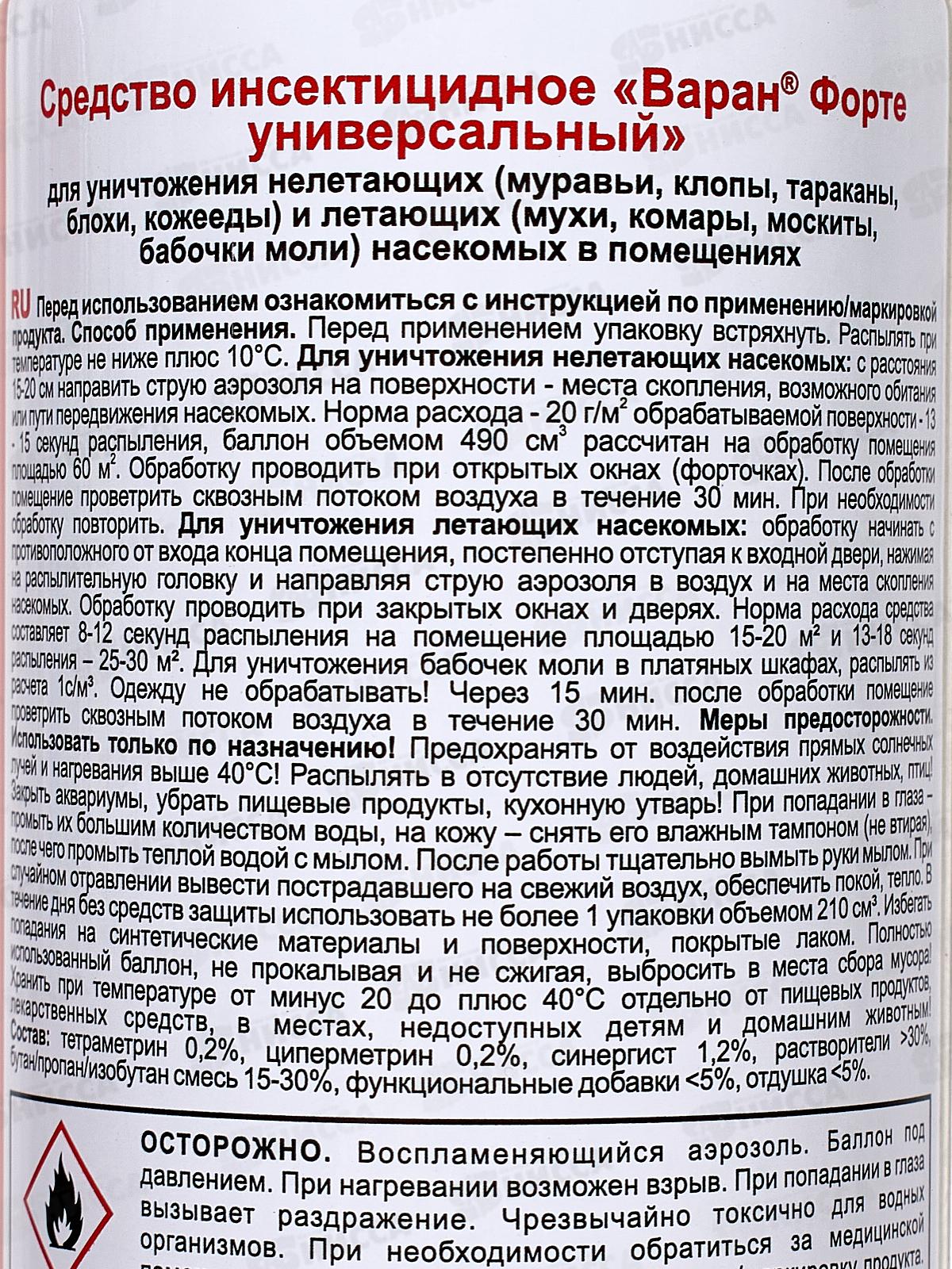 Состав: тетраметрин 0,2%, циперметрин 0,2%, синергист 1,2%, растворители более 30%, бутан/пропан/изобутан смесь 15-30%, функциональные добавки менее 5%.