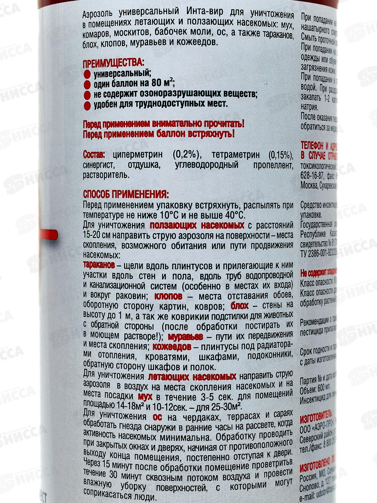 Аэрозоль универсальный Инта - Вир для уничтожения в помещениях летающих и ползающих насекомых: мух, комаров, москитов, бабочек моли, ос, а так же тараканов, блох, клопов, муравьев и кожеедов. Аэрозоль без резкого запаха. Удобен для труднодоступных мест. Д