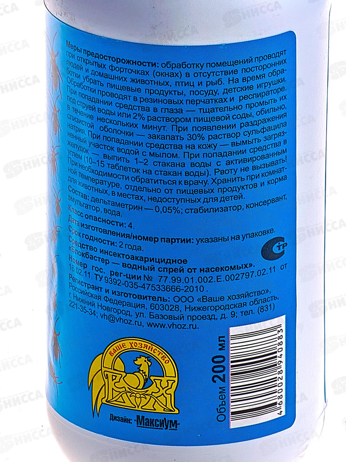Водный спрей от насекомых "Блокбастер XXI" Ваше Хозяйство. Для уничтожения тараканов, муравьев, клопов, блох, мух. Обрабатывать места обитания, скопления, обнаружения, пути передвижения или места посадки насекомых.