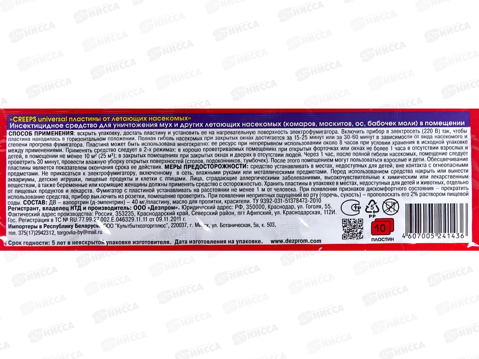 Средство для уничтожения мух, комаров, москитов, ос, бабочек моли для использования с электрофумигатором. Вскрыть упаковку, достать пластину и установить ее на нагревательную поверхность электрофумигатора. Включить прибор в электрическую сеть (220В) так, чтобы пластина находилась в горизонтальном положении. Комары начинают погибать через 10-15 минут после включения фумигатора в сеть, полная гибель наступает через 25-60 минут. Состав: ДВ - вапортрин, масло для пропитки, красители.