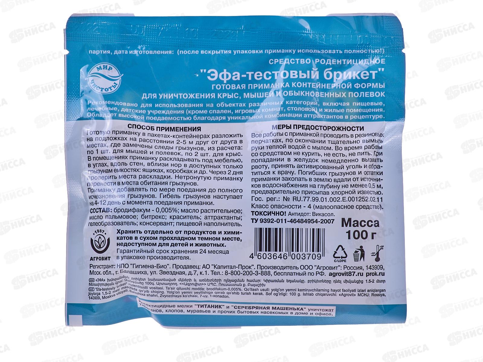 Средство родентицидное ЭФА-тестовый брикет представляет собой готовую пищевую приманку контейнерной формы синего цвета. Приманка обладает высокой поедаемостью благодаря введению в ее рецептуру растительного масла с добавлением аттрактантов. Гибель грызунов наступает через 4-10 суток, хотя они могут получить смертельную дозу в течение 1-2 дней. Эфа тестовый брикет обладает высокой родентицидной активностью в отношении: крыс, мышей, полевок.
