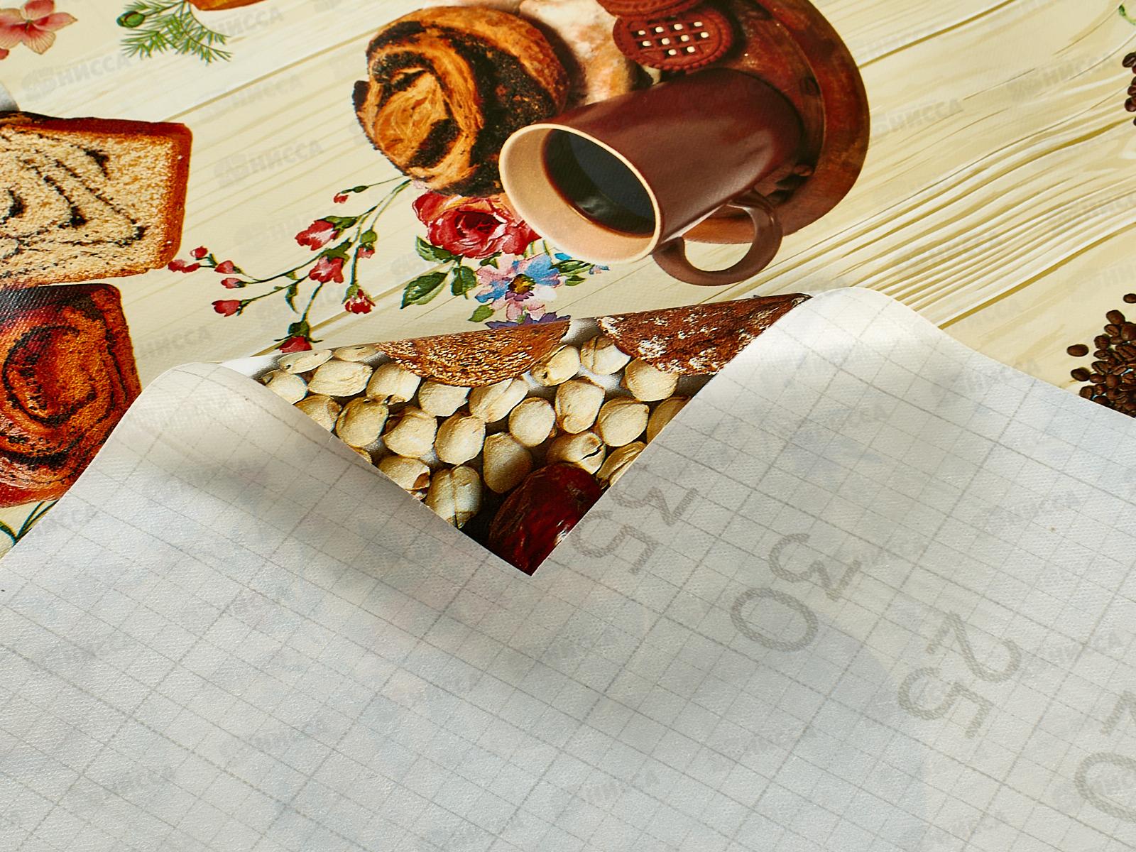 Поверхность клеенки полуматовая, гладкая. На основу нанесена разметка для удобства отмеривания и нарезания клеенки.