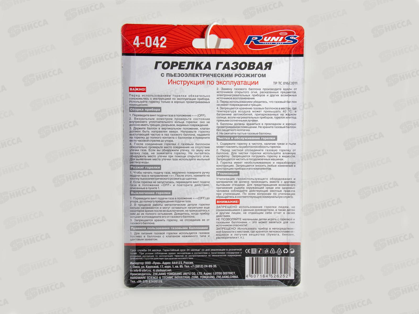 Горелка газовая пьезо №8, черная RUNIS (цанг.) 4-042