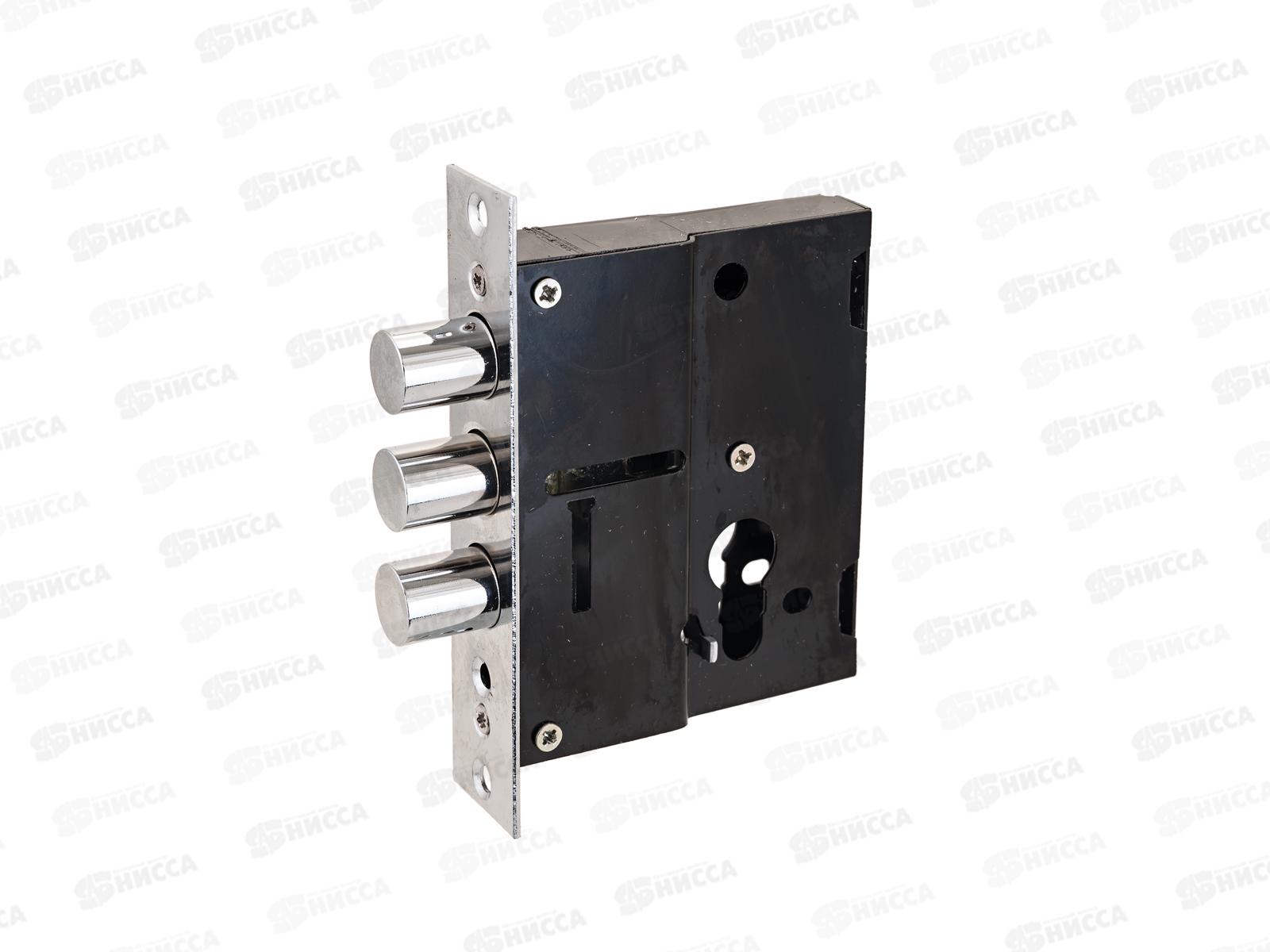 Замок врезной цилиндровый, без механизма секрета. Предназначен для установки в двери китайского производства, в качестве дополнительного замка. Три цилиндрических стальных хромированных ригеля, диаметр 17,5 мм. Вылет ригелей 21 мм. Стальной корпус. Удаление ключевого отверстия 60 мм. Цвет торцевой планки - хром, ширина 30 мм.