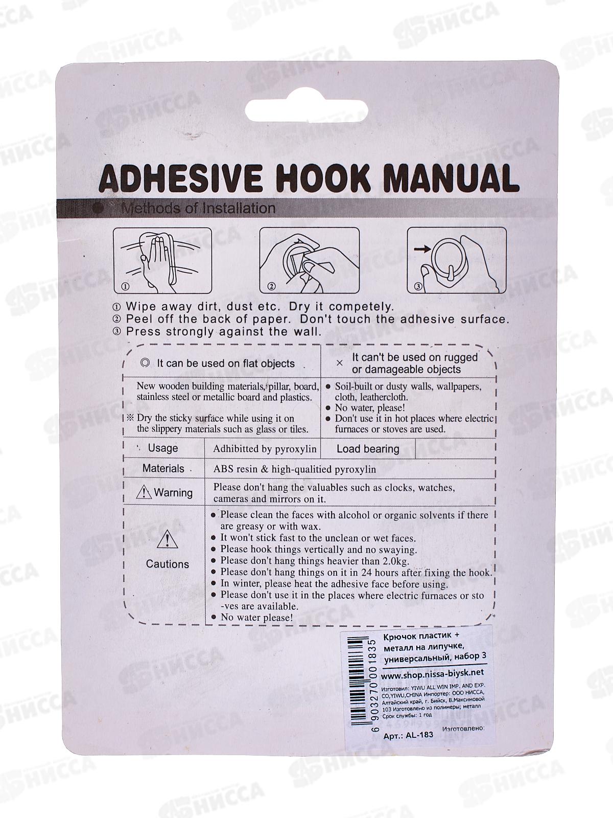 Крючок пластиковый на липучке, универсальный, набор 3 шт., AL-183 *160