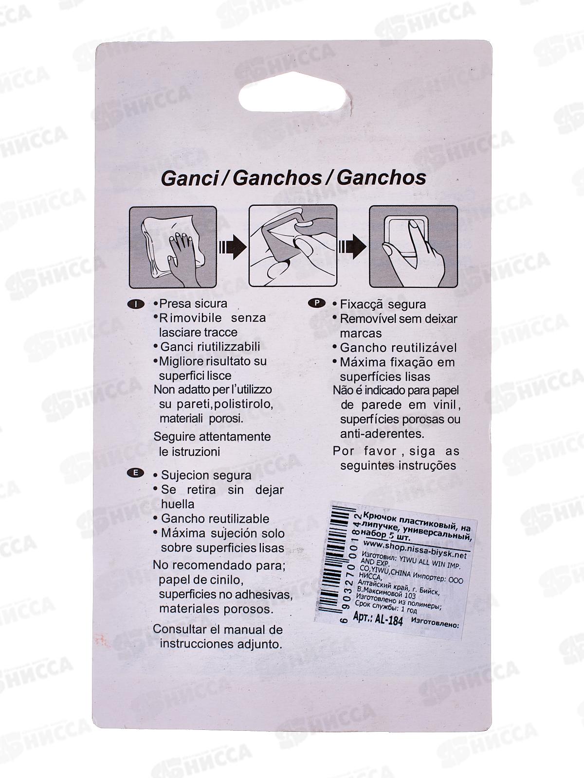 Крючок пластиковый на липучке, универсальный, набор 5 шт., AL-184 *160
