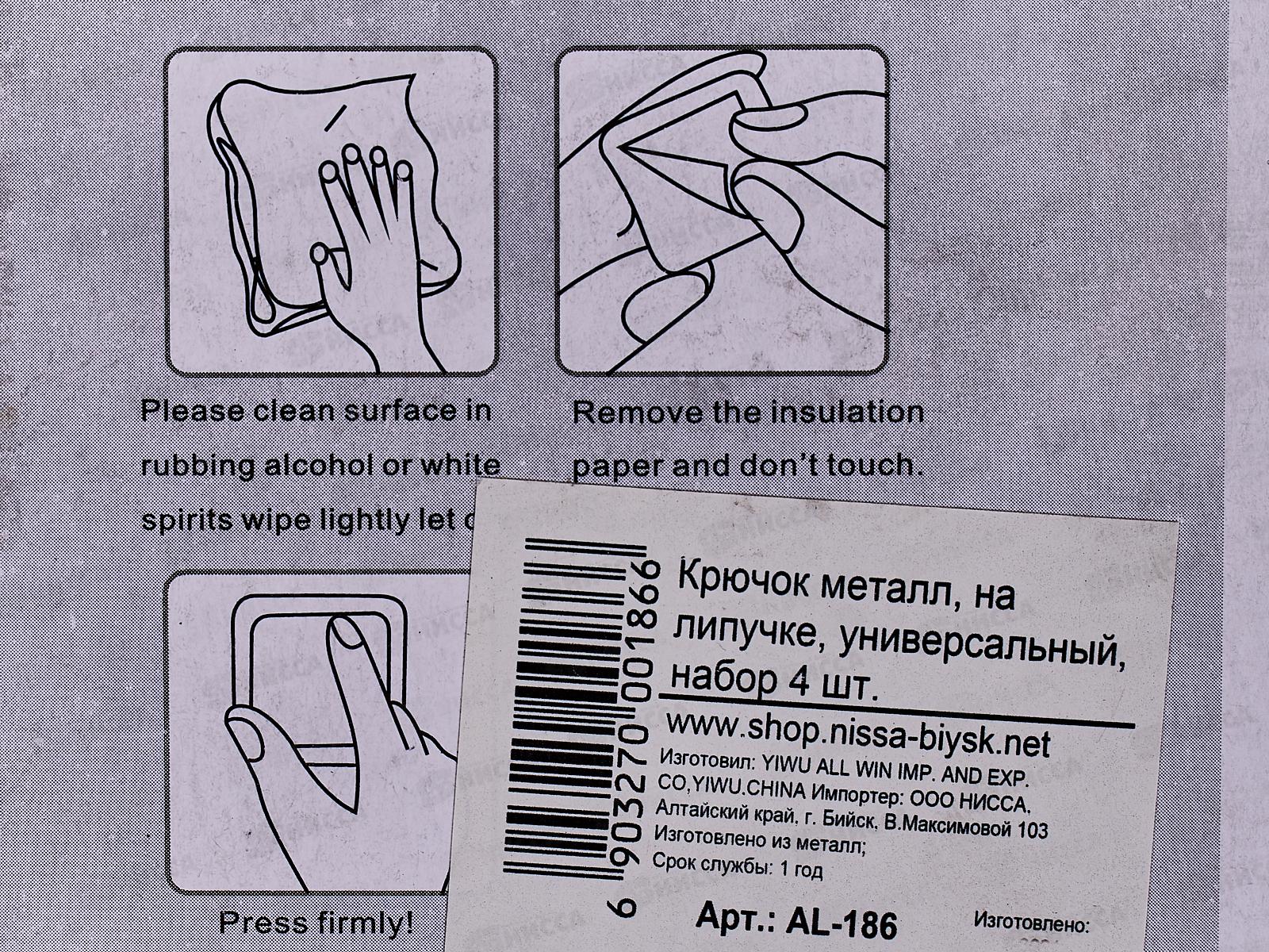 Крючки для полотенец, на липучке, набор 4шт, AL-186 *24