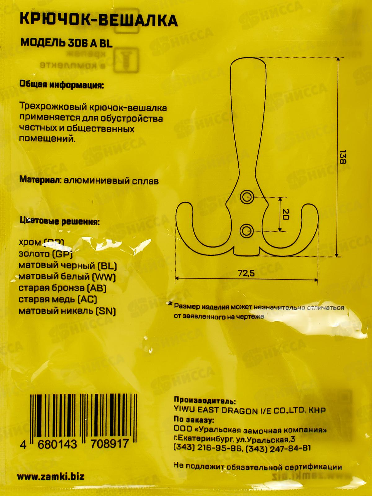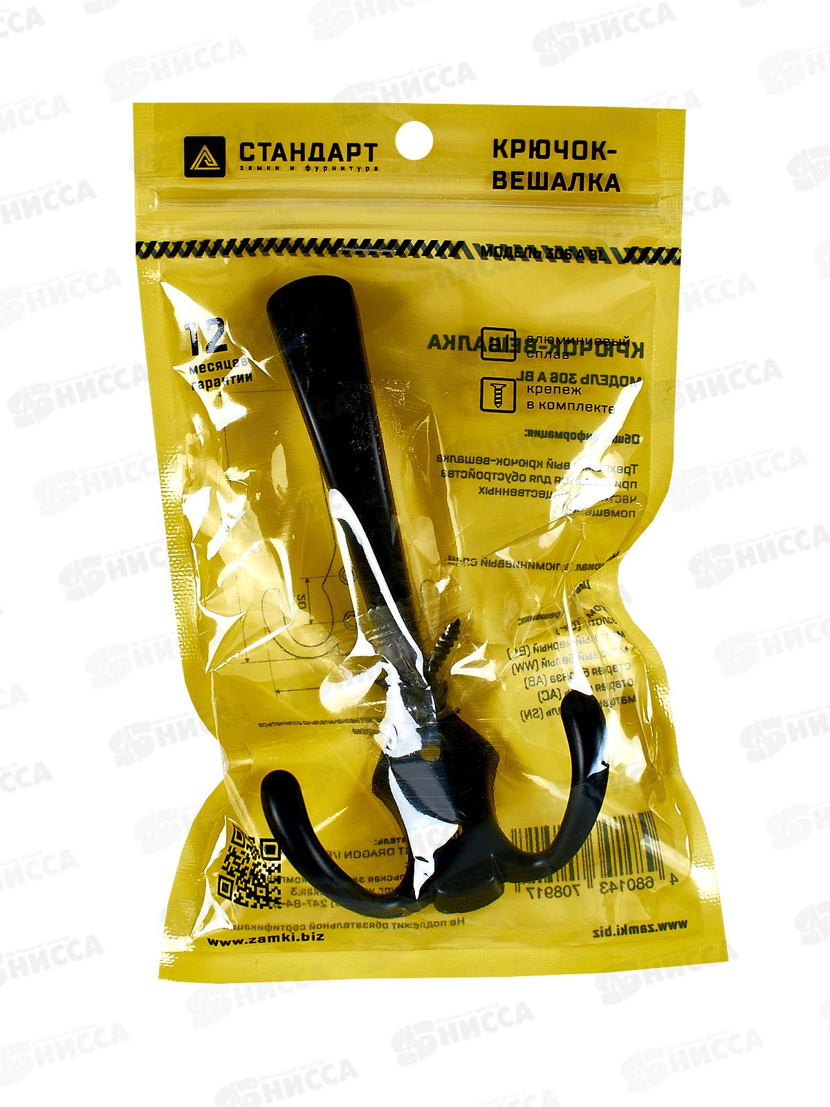 Крючок-вешалка Стандарт 306 А BL матовый черный ЕВРОПАКЕТ15843 *16