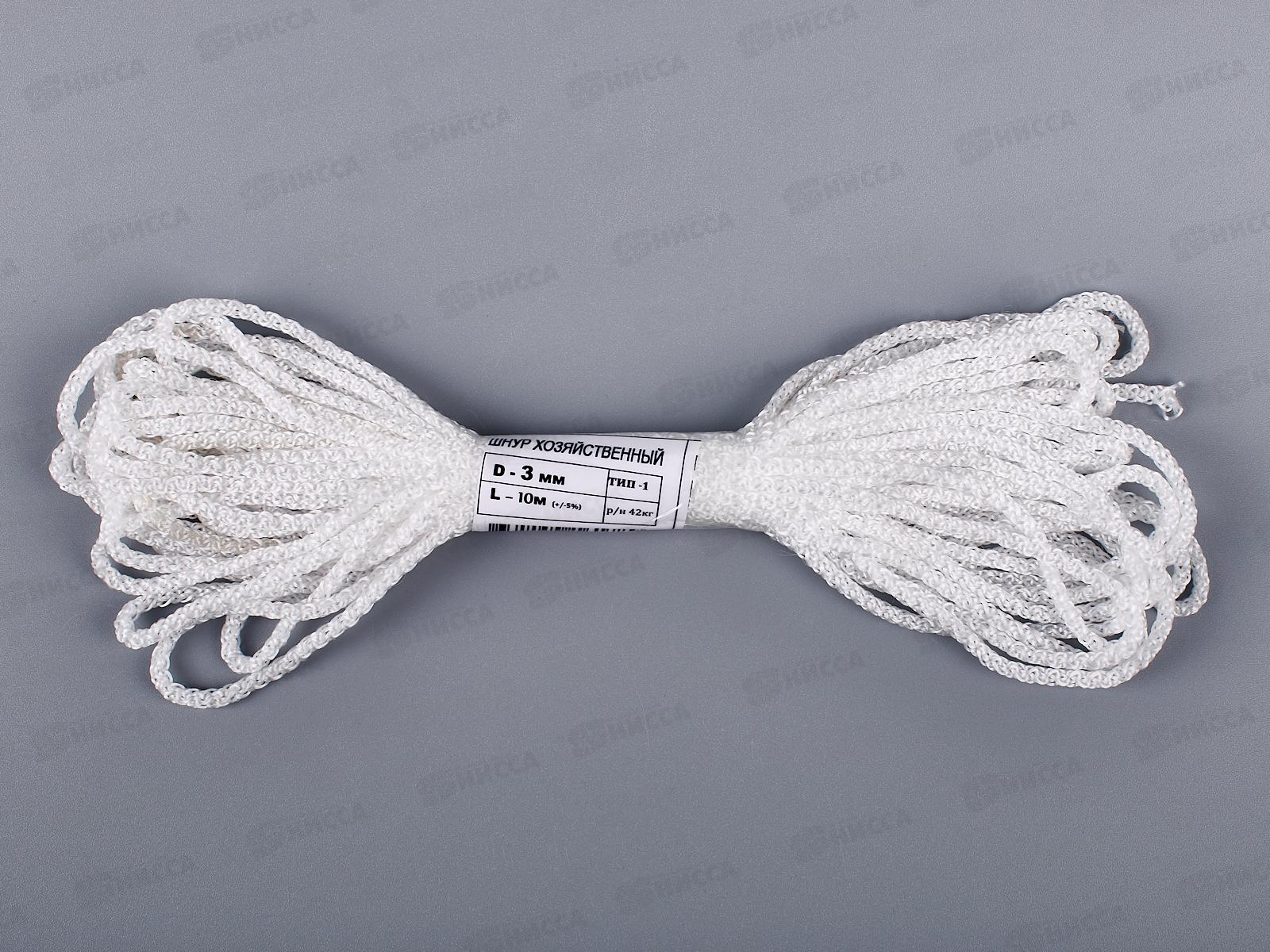 Шнур хозяйственный №3 предназначен для различных бытовых и хозяйственных целей. Бытовой шнур обладает высокой прочностью, устойчив к действию щелочей, растворителей и кислот, не впитывает влагу. Длина шнура - 10 м.