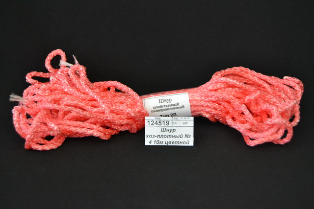 Шнур хозяйственный, плотный, цветной №4 предназначен для различных бытовых и хозяйственных целей. Бытовой шнур обладает высокой прочностью, устойчив к действию щелочей, растворителей и кислот, не впитывает влагу. Длина шнура - 10 м.