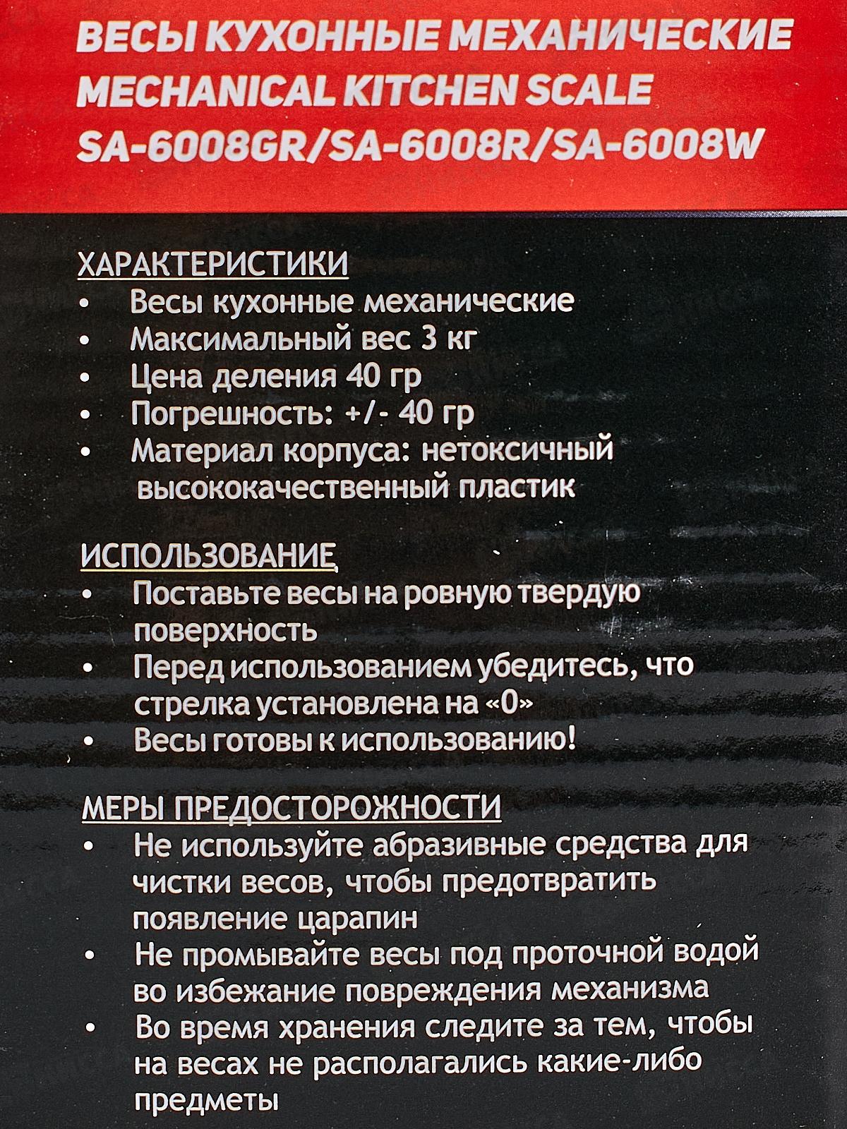 Определяйте с помощью механических кухонных весов Sakura SA-6008W точное количество ингредиентов для новых блюд и заготовок на зиму. Благодаря надёжному механизму устройство покажет массу продуктов с незначительной погрешностью. Пластиковый корпус практичен и прочен, а отсутствие электронных деталей позволит использовать прибор в любое время, не заботясь о питании. Цена деления весов составляет 25 грамм, максимальная нагрузка — 3 килограмма.