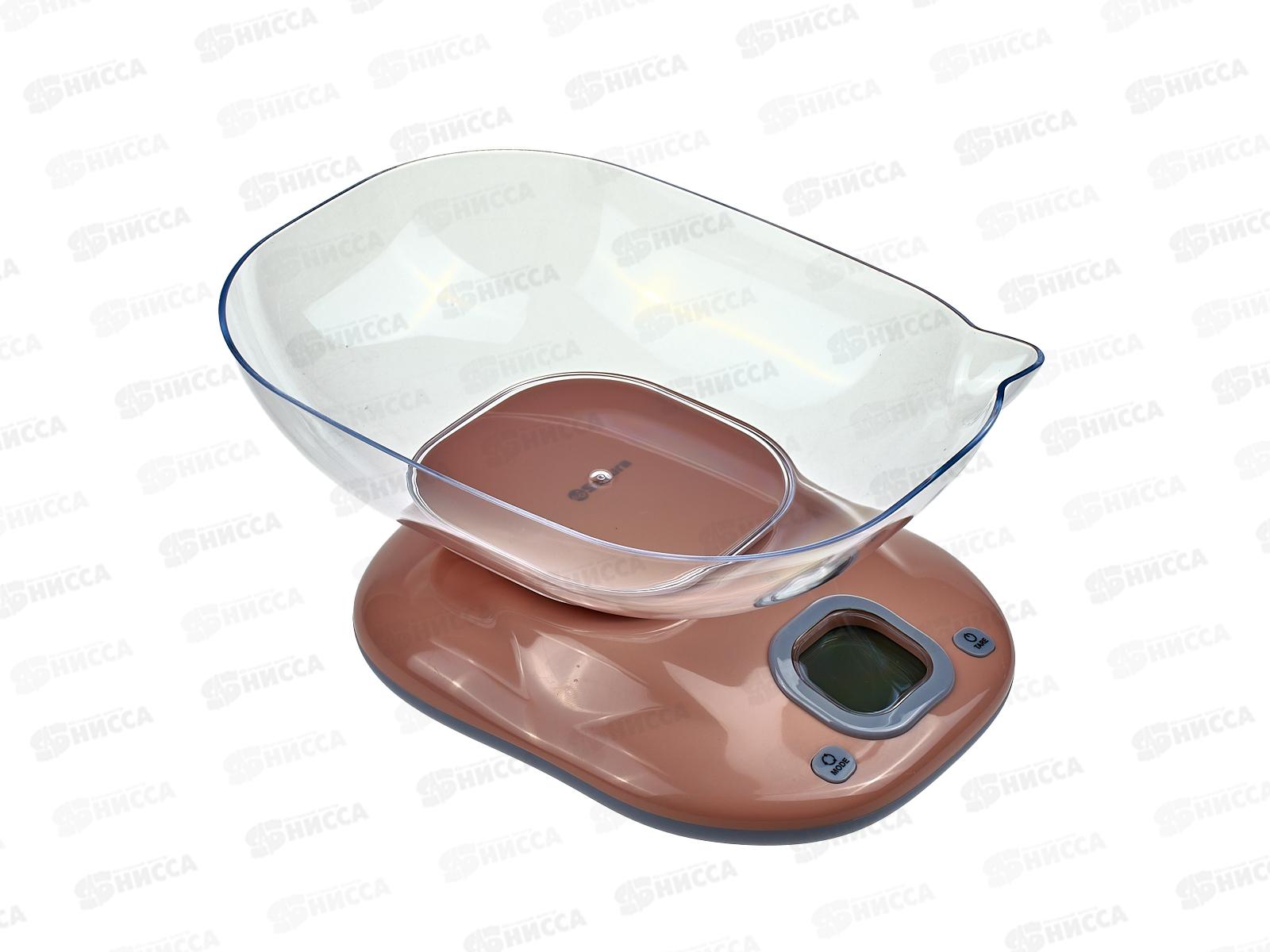 Весы электронные, нагрузка 5 кг, цена деления 1 г, LCD дисплей с белой подсветкой, учет веса тары, автомат.отключение, питание 2хААА, пластик.корпус и чаша, цвет: бежевый/серый