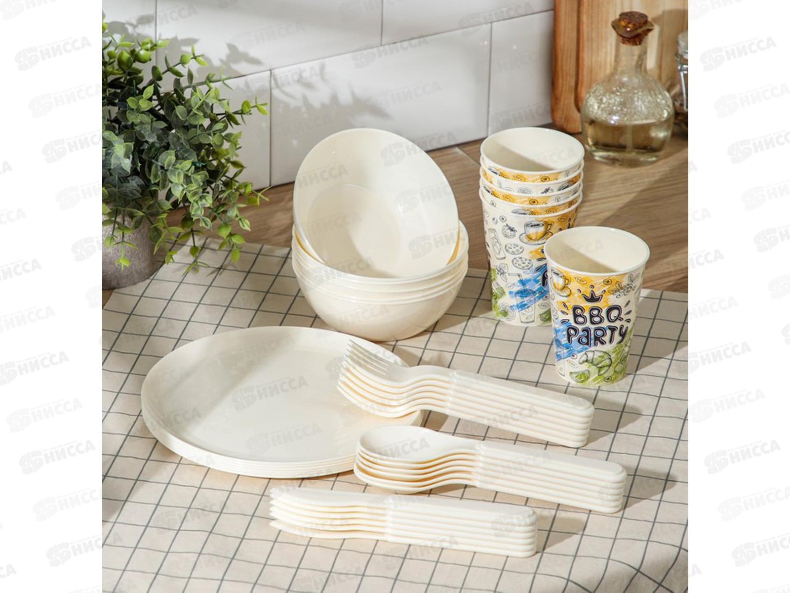 Состав набора: контейнер для набора - 1 шт, тарелка d 20 см - 6 шт, миска d 13 см - 6 шт,