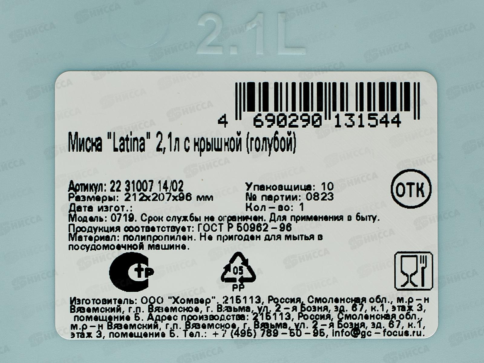 Миска 2,1л Latina с крышкой голубой 223100714/02 *18