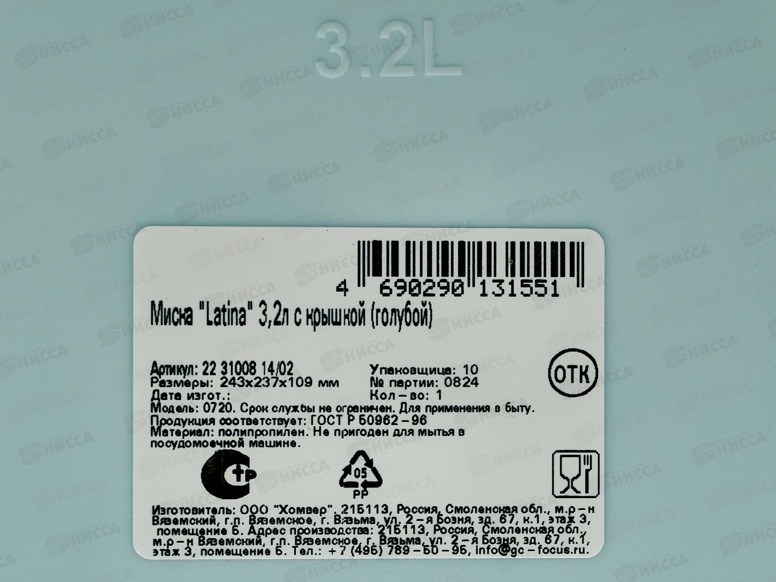 Миска 3,2л Latina с крышкой голубой 223100814/02 *15
