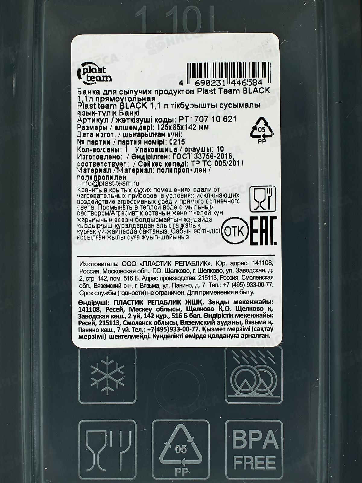 Банка д/сып прод 1,1л "Plast Team" прямоуг Блэк РТ170710621 *10