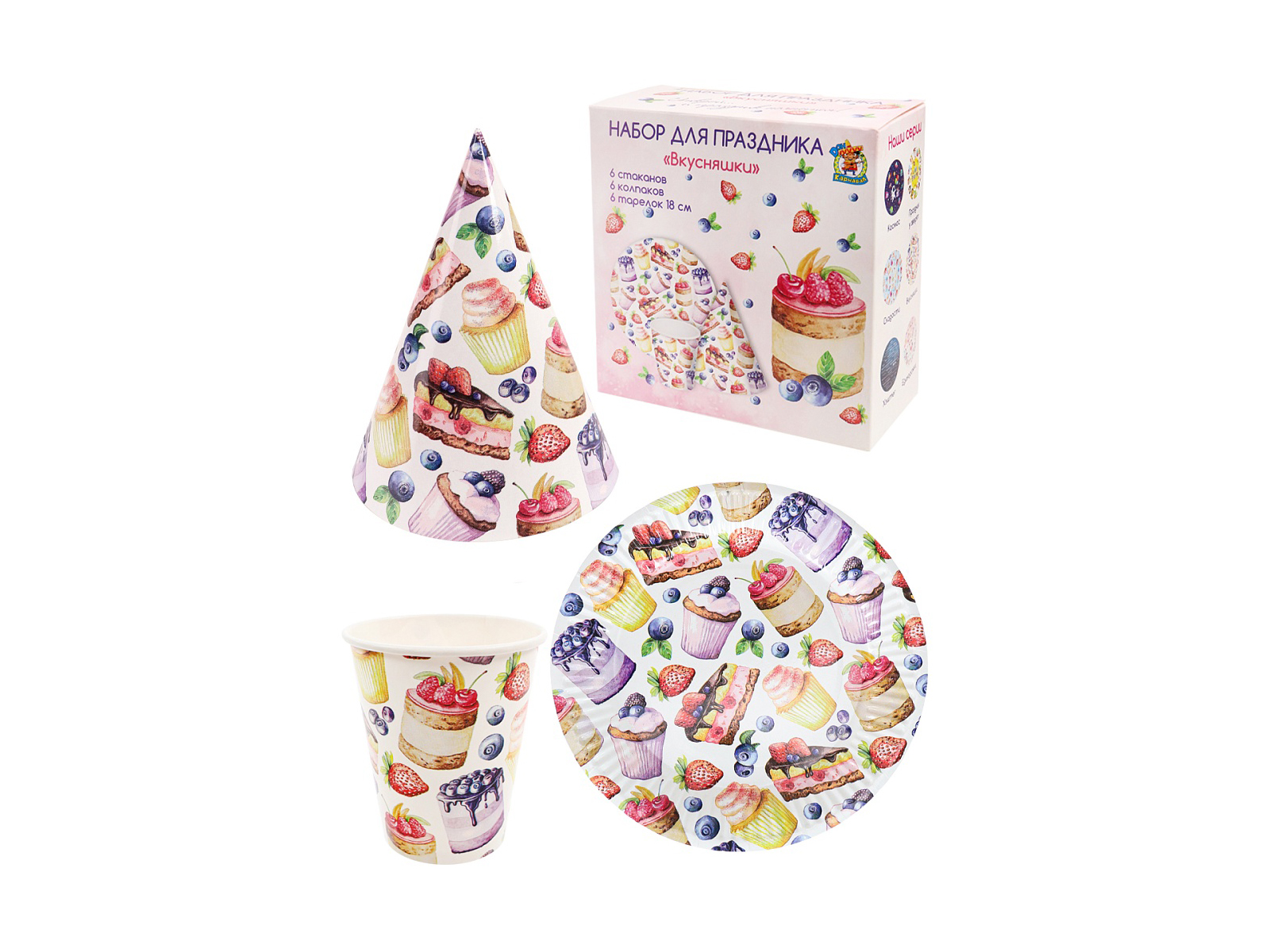 Набор для праздника Вкусняшки (тарелка 6, стаканы 6,колпаки 6) ФЛ-6210