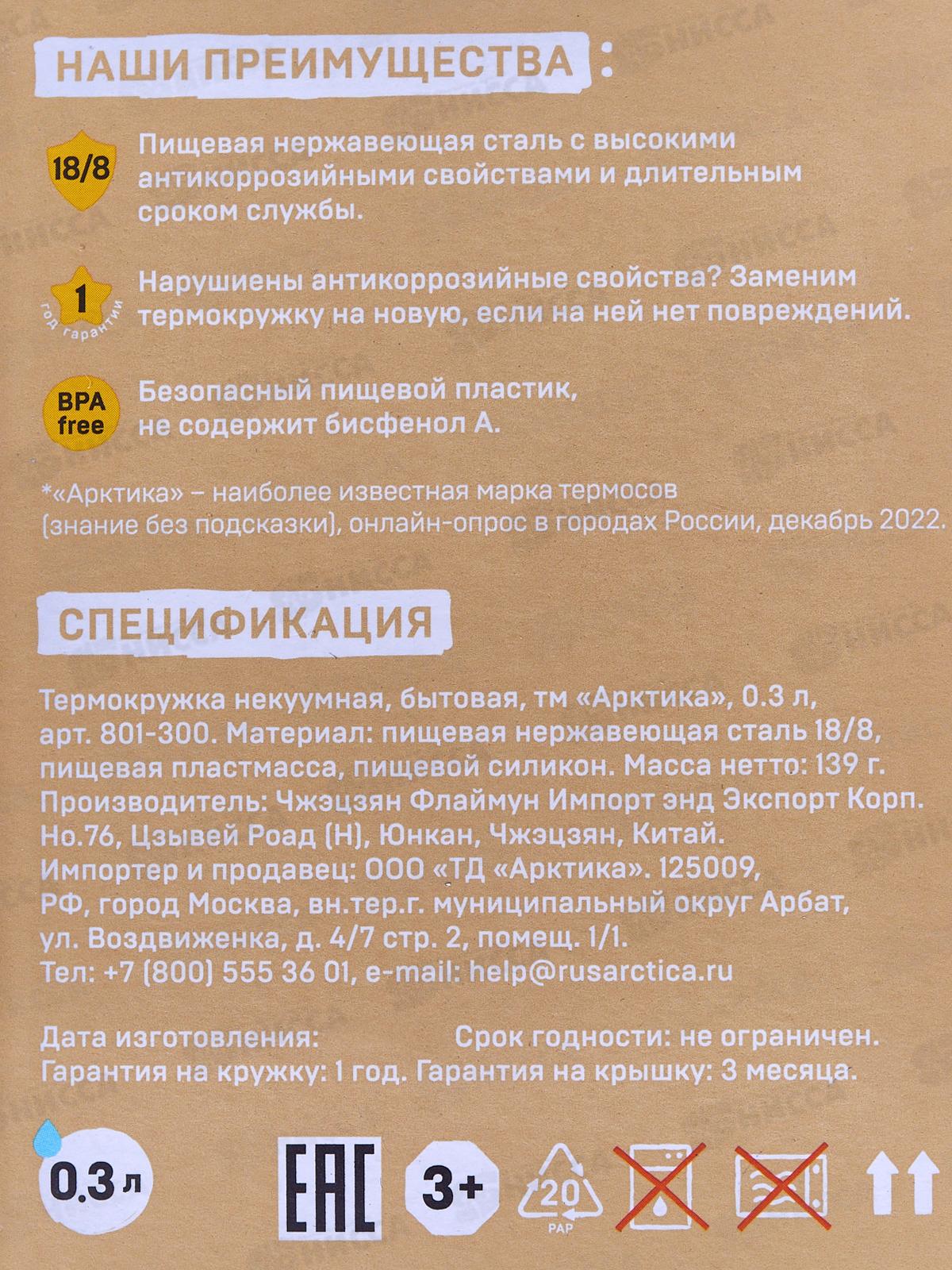 Термокружка 300мл невакуумная, 801-300, тм "Арктика" *6