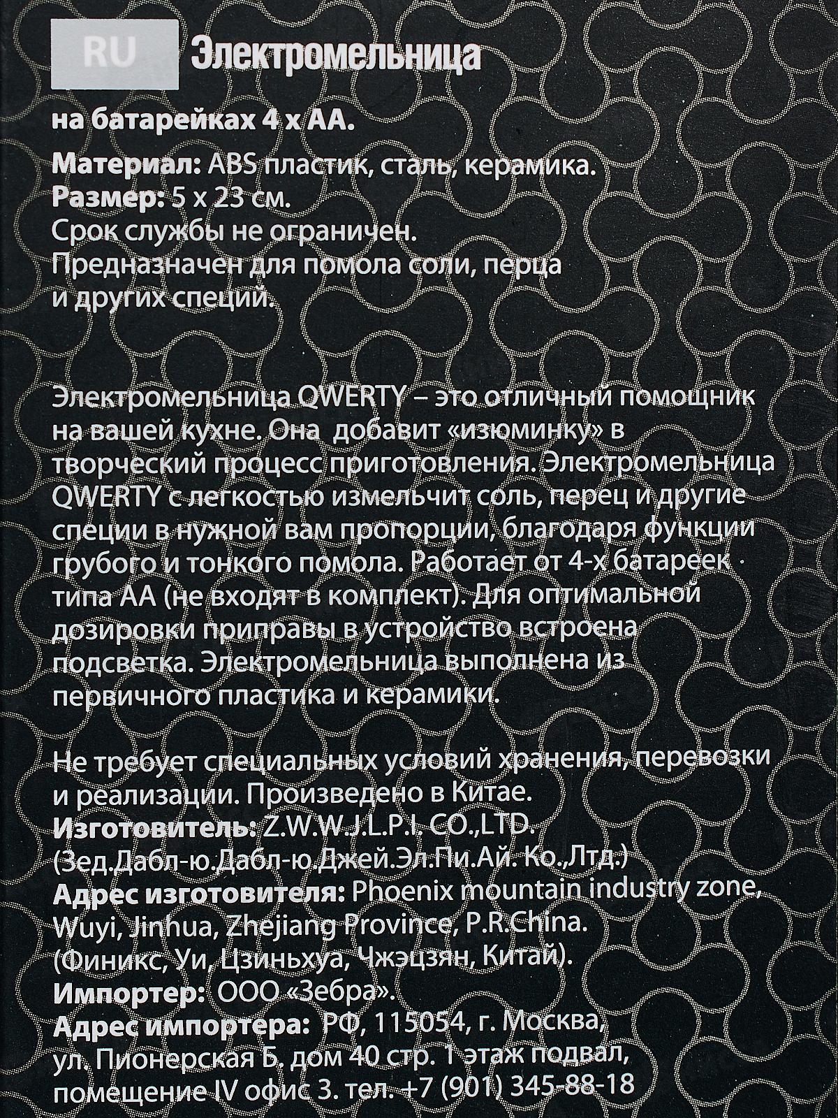 Электромельница перец/соль, металлическая, 5х23см, на батарейках 4хАА, 71002 QWERTY