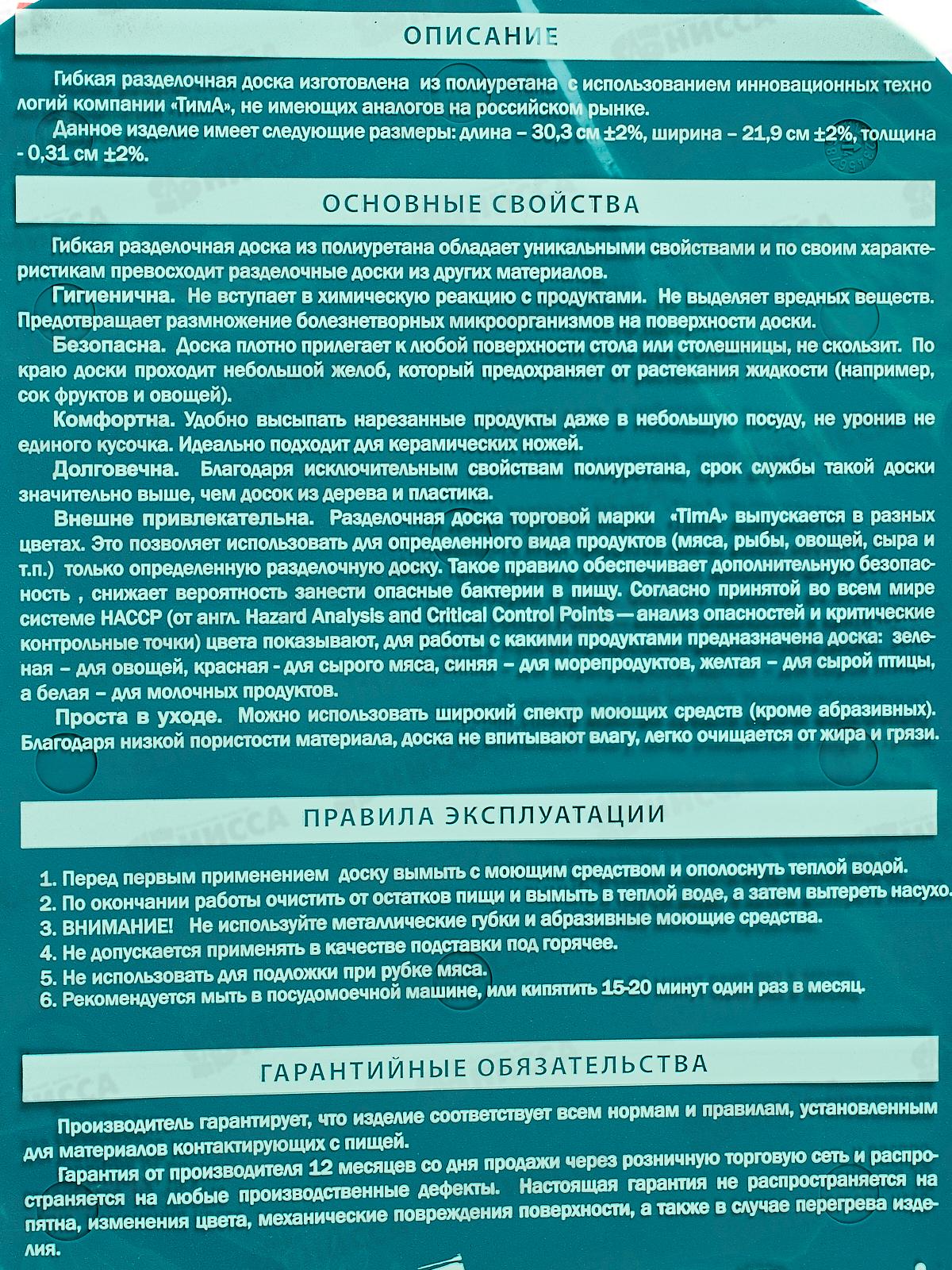 Разделочная доска из полиуретана - собственная инновационная разработка компании «TimA», не имеющая аналогов на российском рынке. Она обладает уникальными свойствами и по своим характеристикам превосходит разделочные доски из любых других материалов. Не вступает в химическую реакцию с продуктами. Благодаря отсутствию пористости полиуретана, болезнетворные микроорганизмы (бактерии, грибки плесени и запахи) легко удаляются с поверхности, в отличие от деревянных разделочных досок. А специальная добавка с активными ионами серебра убивает все известные бактерии и микроорганизмы уже на стадии нарезки продуктов. При резке лезвие ножа взаимодействует с упругой эластичной поверхностью, что сохраняет остроту ножа (в отличие от разделочных досок из других материалов). Доска плотно прилегает к любой поверхности стола или столешницы, не скользит. При работе с острым ножом это очень важно в плане безопасности. По краю доски проходит небольшой желоб, который предохраняет от растекания жидкости (например, сок фруктов и овощей). Благодаря исключительным свойствам полиуретана, срок службы такой доски значительно выше, чем досок из дерева и пластика. Единственные ограничения для досок из полиуретана – не использовать их как подложку для рубки мяса или подставку под горячее. Разделочную доску можно мыть в посудомоечной машине. Можно использовать широкий спектр моющих средств (кроме абразивных). Доска абсолютно не впитывают влагу и запахи продуктов, легко очищается от жира и грязи.