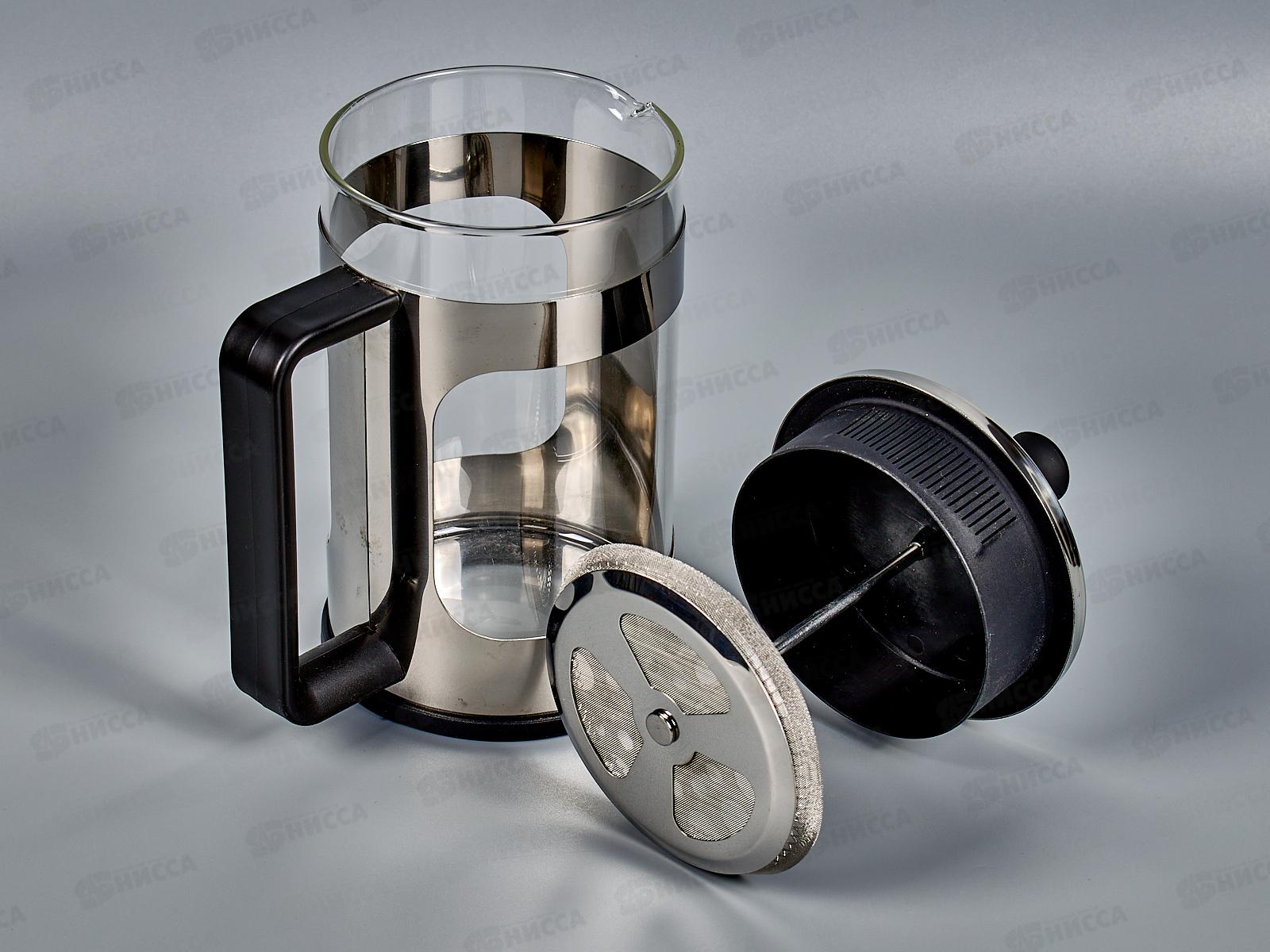 Объем 850мл; материал боросиликатное стекло, нержавеющая сталь, пластик. Френч-пресс изготовлен из жаропрочного боросиликатного стекла, с фильтрующим поршнем из нержавеющей стали, пластиковая ручка и крышка хром. Подходит для заваривания кофе и чая. Посл