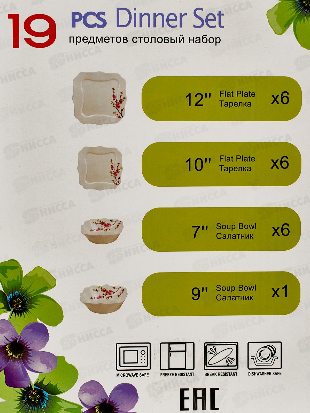 Состав набора: тарелка 12" - 6 шт, тарелка 10" - 6 шт, салатник 7" - 6 шт, салатник 9" - 1 шт.