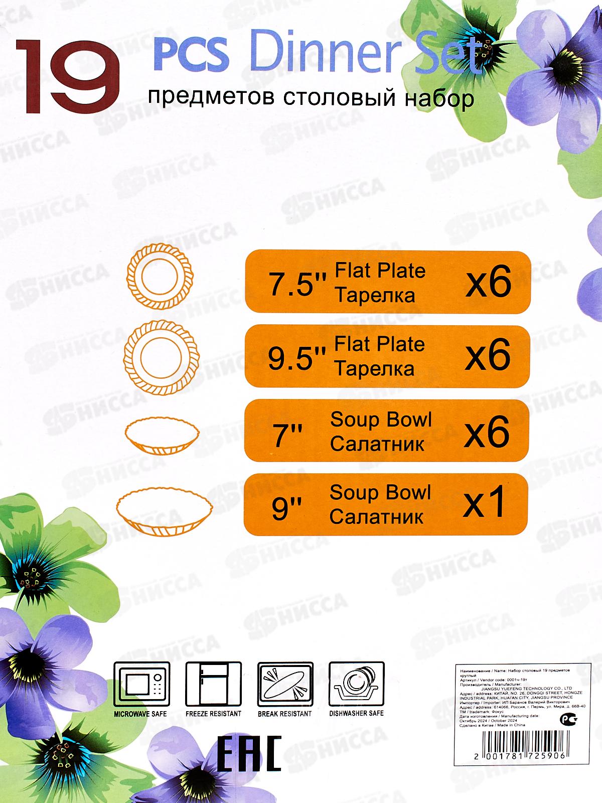 Состав набора: состав набора: тарелка плоская круглая d 19 см - 6 шт, тарелка плоская круглая d 24 см - 6 шт, салатник круглый d 17,5 см, 500 мл - 6шт, салатник круглый d 22,5 см, 1400 мл - 1 шт.
