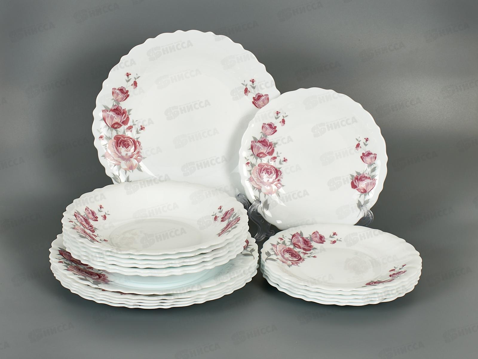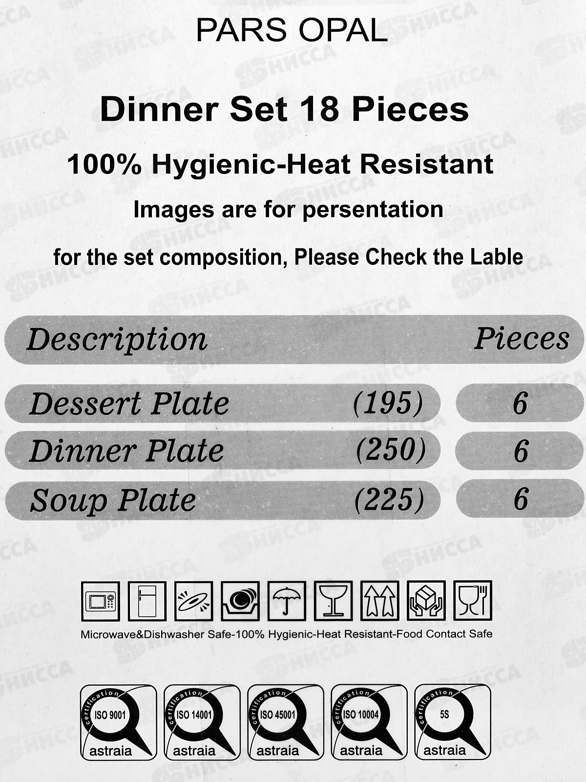 Состав набора: десертные тарелки 195 мм - 6 шт, обеденные тарелки 250 мм - 6 шт, суповые тарелки 225 мм - 6 шт.