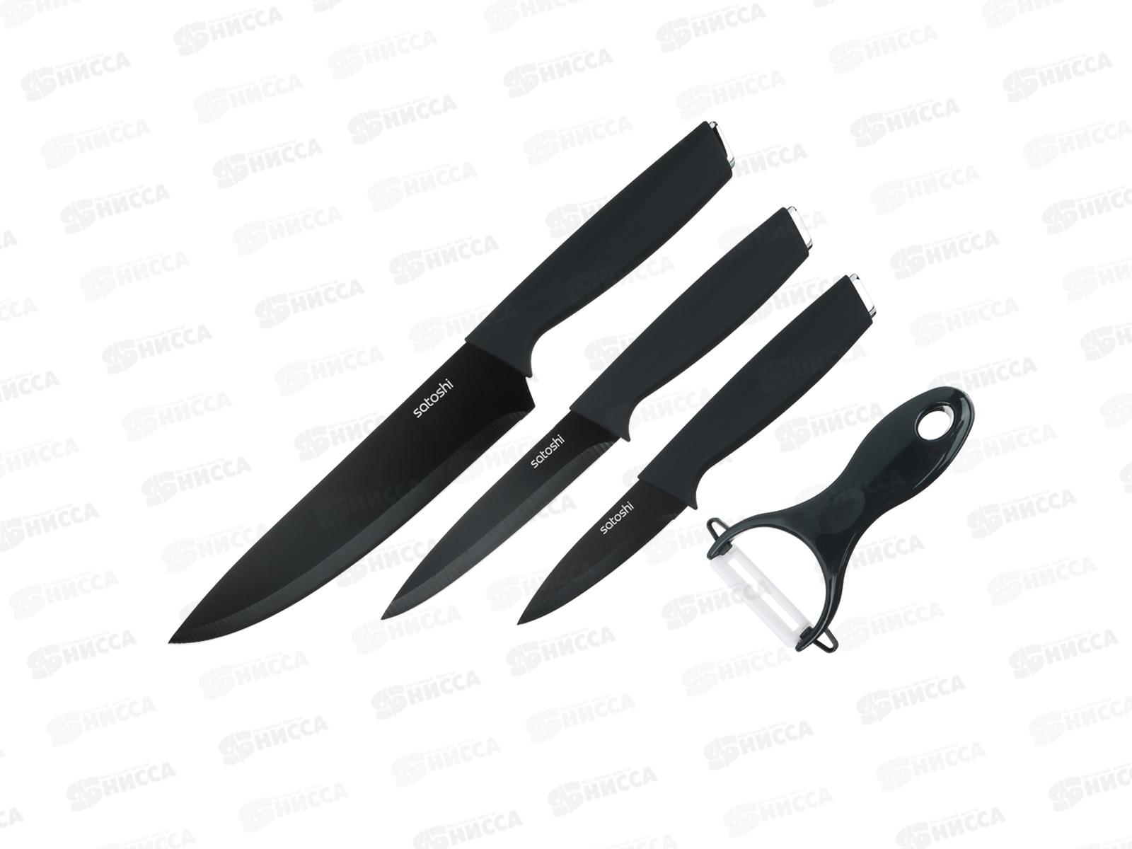 Набор кухонных ножей SATOSHI Орис включает 3 ножа, овощечистку и акриловую подставку для ножей. Комплект ножей поможет выполнять различные задачи на кухне по разделке, нарезке и шинковке продуктов. Нож с длиной клинка 20,3 см удобен для быстрой нарезки овощей, зелени и фруктов. Универсальный нож 12,7 см справится с чисткой овощей и разделкой мяса и рыбы. Маленький нож 8,9 см удобен для вскрытия упаковок, мелких нарезок и чистки продуктов от кожуры. Лезвия из нержавеющей стали имеют острую заводскую заточку, не подвержены коррозии, а также имеют антибактериальное покрытие. Материал овощечистки: керамика, полипропилен.