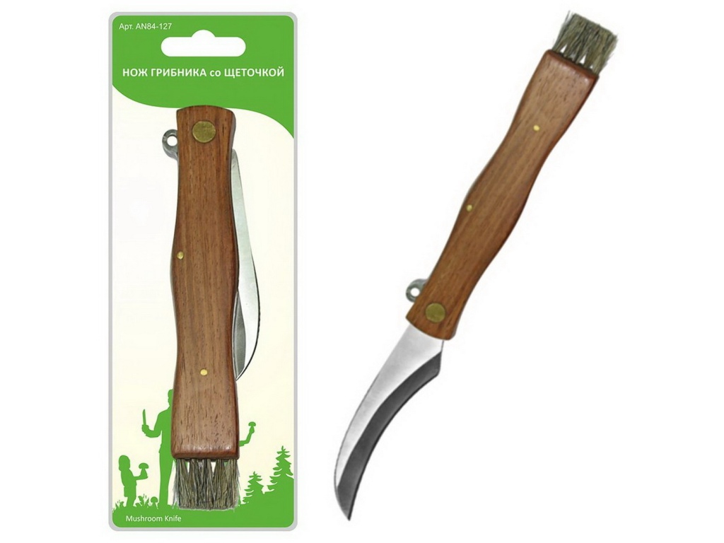 Складной нож предназначен для походов за грибами. Тонким изогнутым лезвием удобно срезать и очищать грибы. На ручке есть кисточка для очистки грибов от земли. Также имеется петля, позволяющая закреплять нож на ремне или корзине с помощью шнура или карабина. Изготовлено: лезвие из нержавеющей стали, накладные детали рукоятки из дерева, щеточка из натуральной щетины. Твердость, HRC: 1.