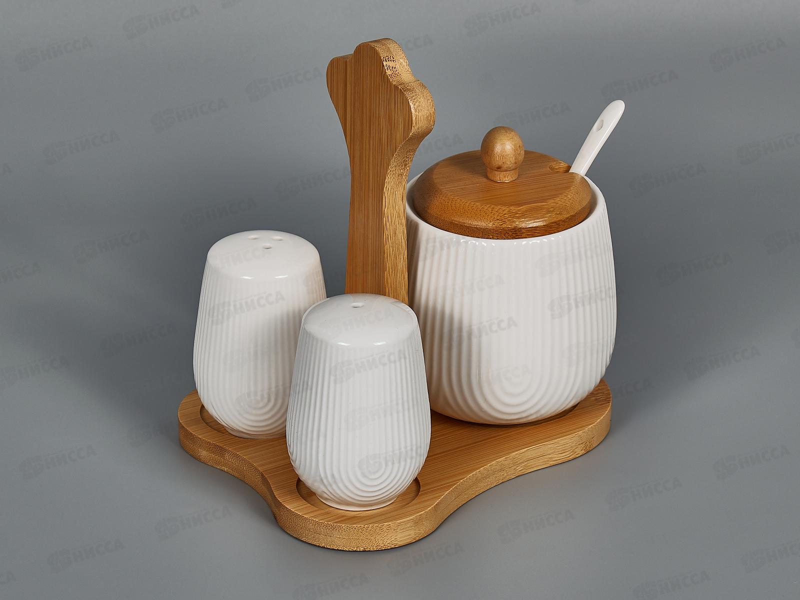 Состав набора: солонка 5х5х7,5 см - 1 шт, перечница 5х5х7,5 - 1 шт, сахарница 8,5х8,5х11 см - 1 шт, ложка 13 см - 1 шт, подставка бамбуковая 15х13х17 см - 1 шт