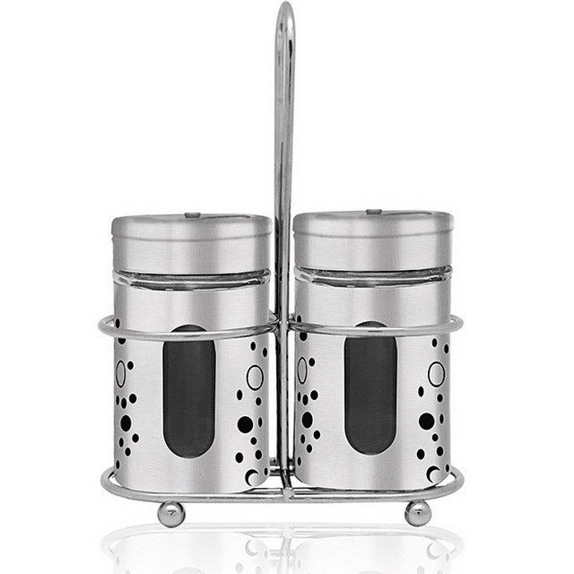 Набор для специй LARA с современным дизайном – это практичный аксессуар для ежедневной сервировки стола. В комплект входит устойчивая проволочная подставка из экологичной высококачественной нержавеющей стали с матовой полировкой. Конструкция с удобным кронштейном для переноски и отделениями для хранения двух ёмкостей для специй. Солонка и перечница выполнены из прозрачного стекла установленного в корпус из нержавейки с прорезями для контроля уровня наполнения. Съёмные винтовые крышки имеют возможность прикрыть отверстия для специй, чтобы они не выдыхались и не отсыревали. Можно мыть в посудомойке. Узор чёрного цвета на корпусе.