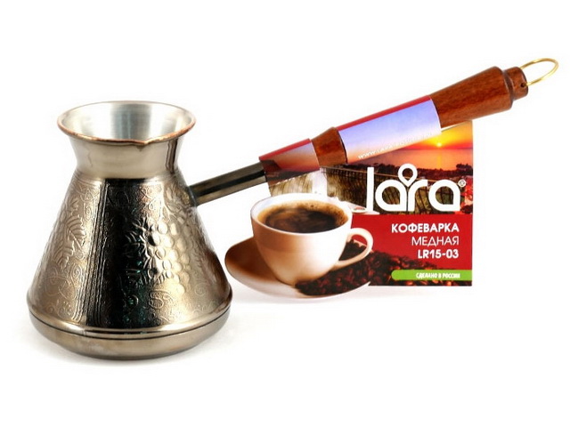 Как приятно выпить чашку свежего только что сваренного кофе. Подлинная находка для любителей настоящего ароматного напитка – турка LARA. Турка латунного цвета выполнена из высококачественной меди в аутентичном дизайне с изящным узором «Виноград». Произведено в России. Удобная лакированная ручка из натурального дерева не будет нагреваться при использовании, а металлическое кольцо позволит подвешивать турку и удобного хранить её. Узкое горлышко способствует наилучшему раскрытию вкуса. Подходит для приготовления натурального кофе на газовых и электрических плитах. Турка дополнит кухонный интерьер и подарит новый опыт в приготовлении кофе.