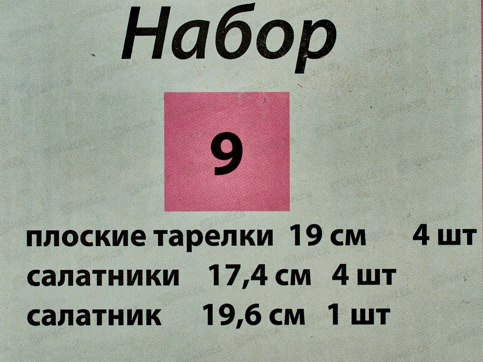 Состав набора: плоские тарелки d 19 см - 4 шт, салатники d 17,4 см - 4 шт, салатник d 19,6 см - 1 см.