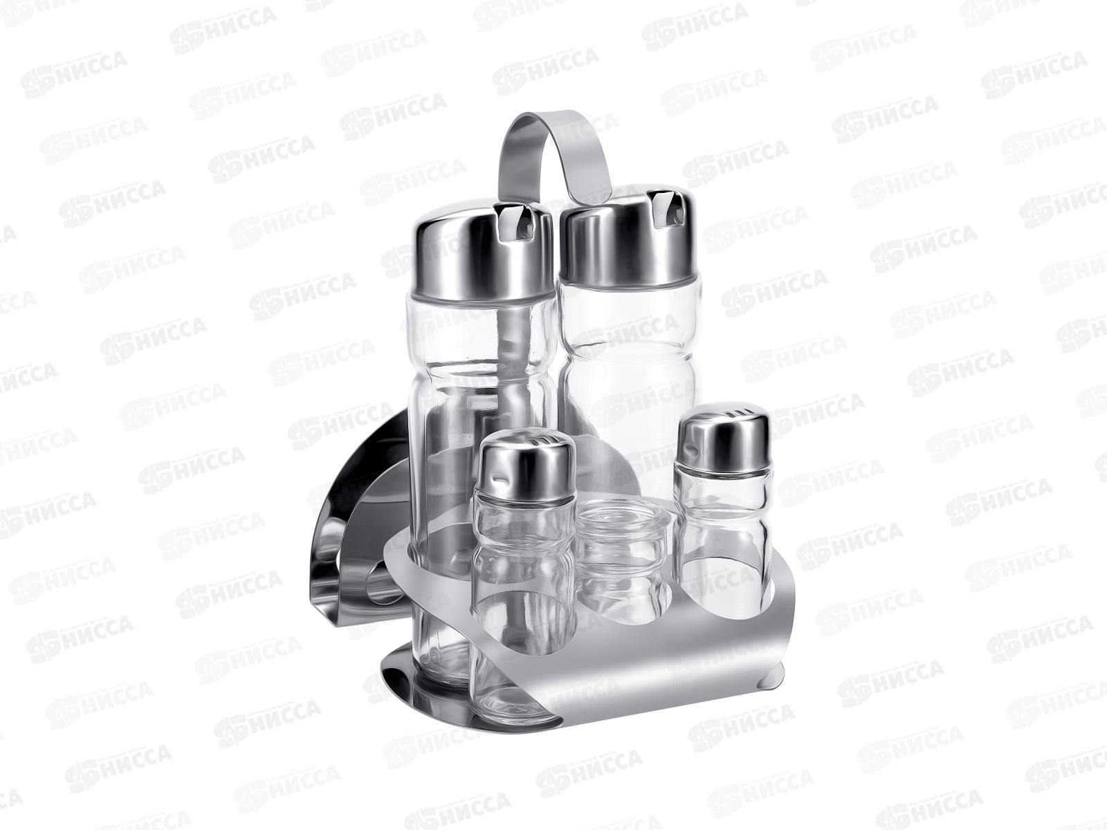 Набор для специй 93-DE-AR-19 включает в себя 2 баночки для сыпучих специй, две баночки для масла, соевого соуса и прочих продуктов, а также подставку для зубочисток и для салфеток.