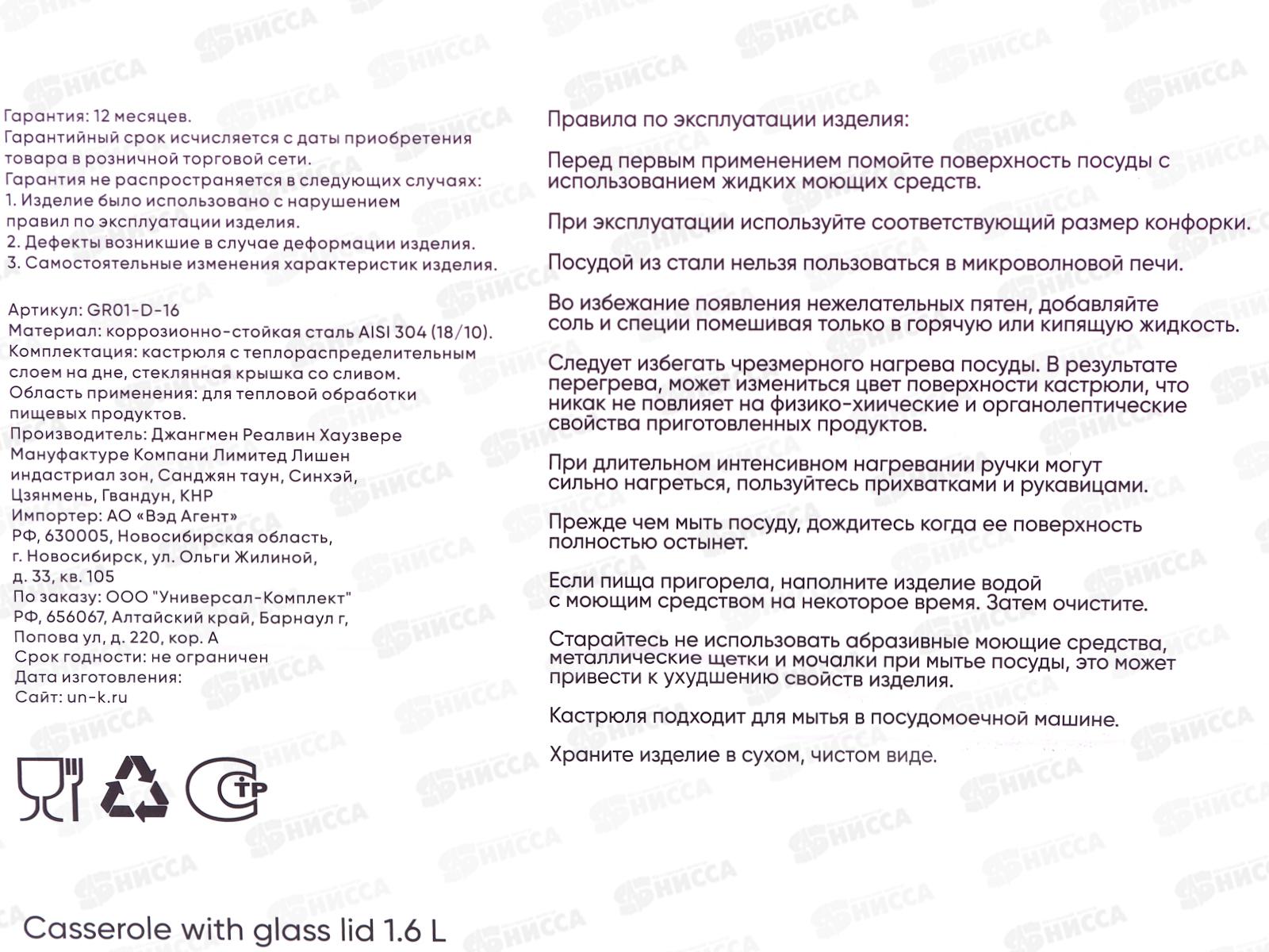 Кастрюля Nord 1,6л 16*9.5см 304 сталь GR01-D-16
