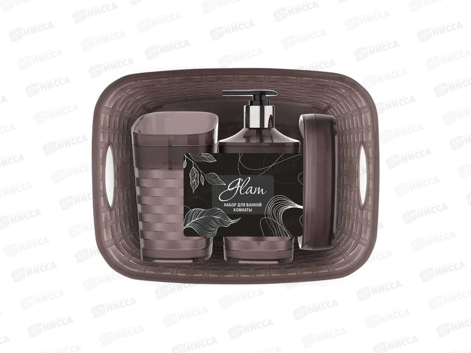 Состав набора: диспенсер для жидкого мыла, стакан для зубных щеток, мыльница, корзинка