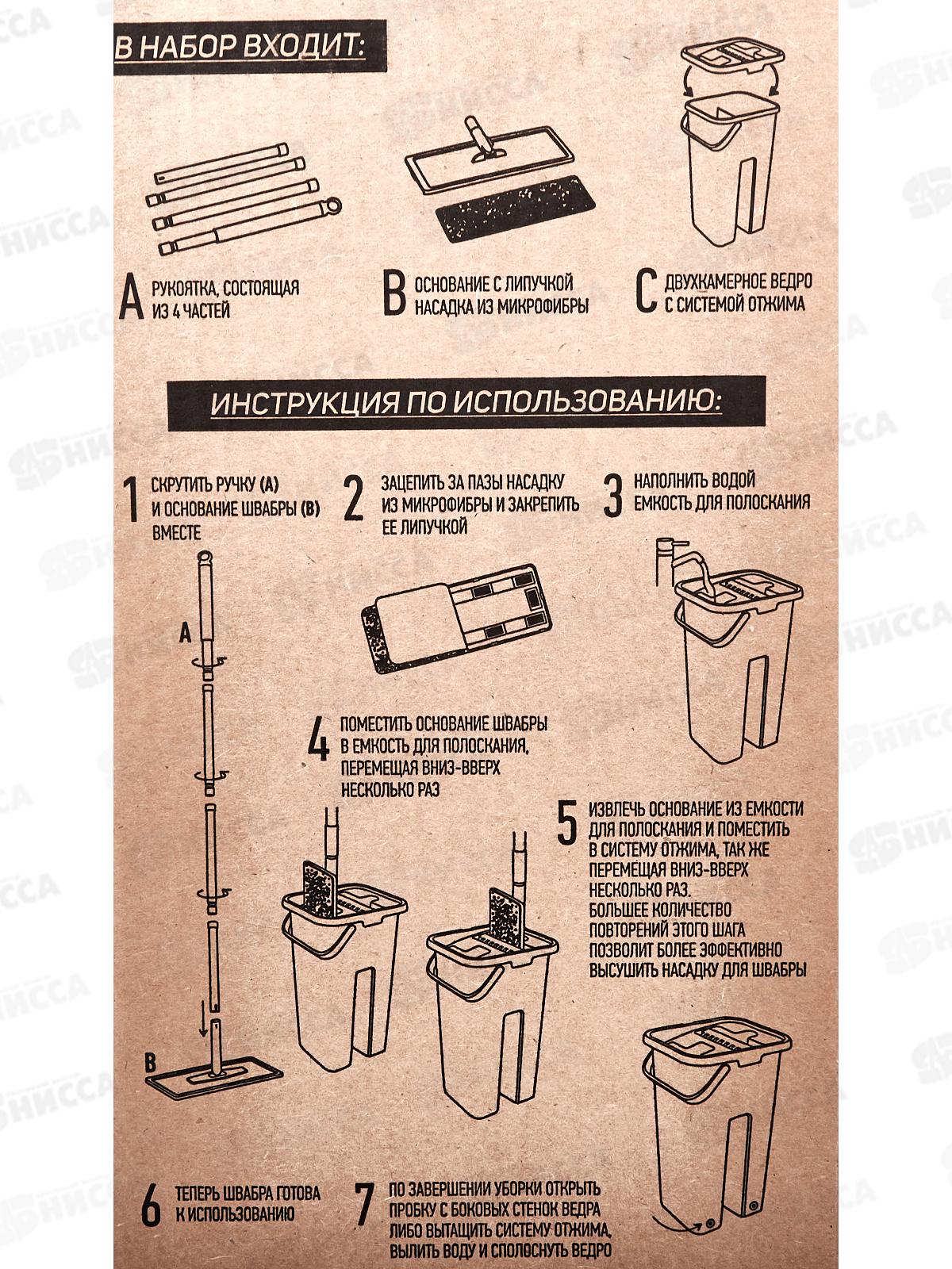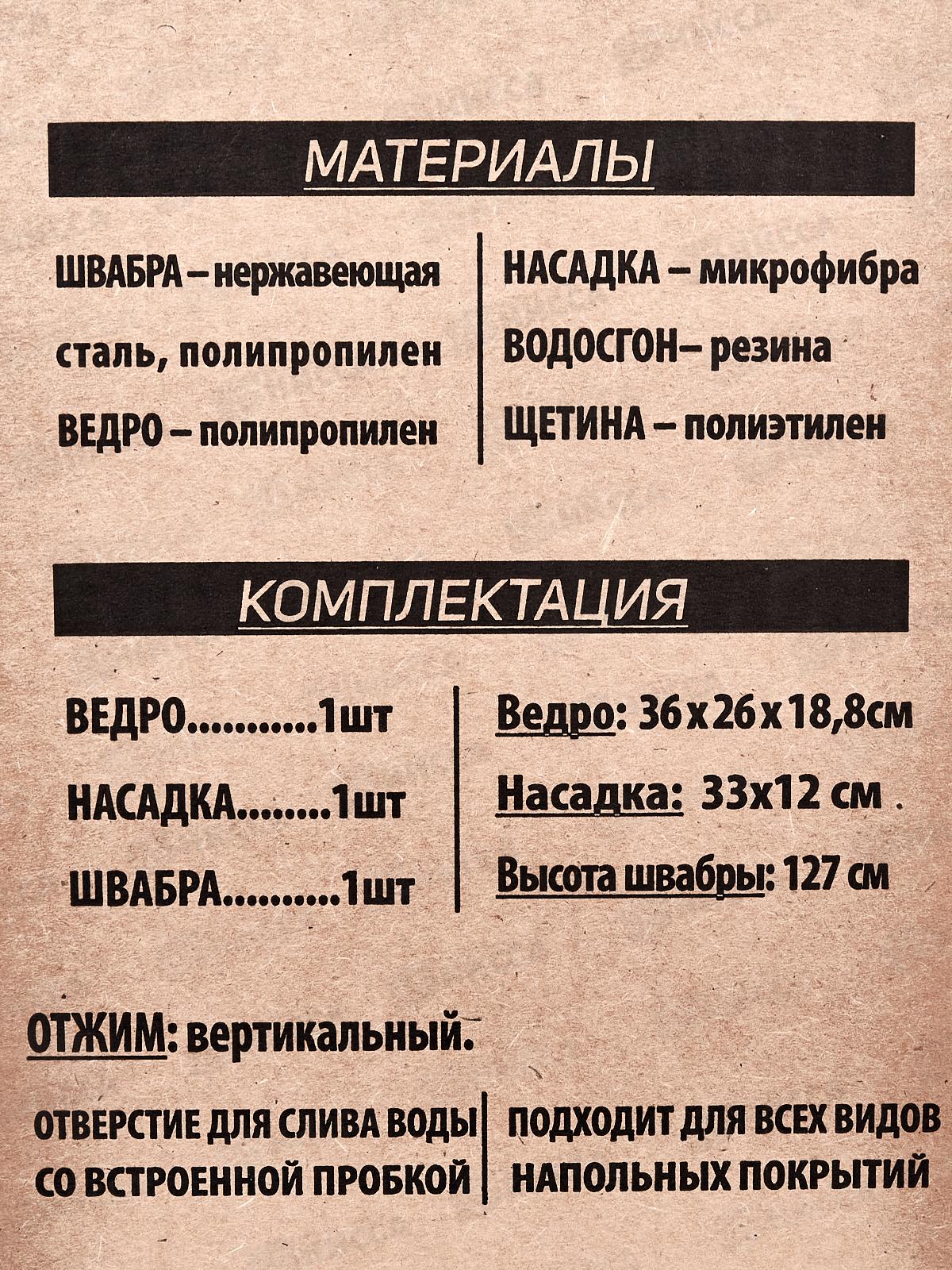 Швабра для пола с насадкой из микрофибры и 2-камерным ведром. Уникальная система полоскания и отжима, позволяют полностью удалять грязь с насадки. Швабра легко проходит под мебелью. Хорошо удаляет шерсть животных и волосы. Слив воды происходит через сливное отверстие в ведре.