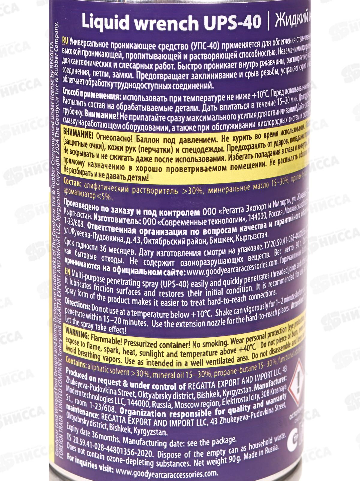 Универсальное средство УПС-40 Goodyearприменяется для очищения резьбовых и других металлических соединений от ржавчины и окислившихся наростов. Позволяет вернуть подвижность металлическим соединениям различного характера. Состав: алифатический растворитель ?30%, минеральное масло 15-30%, пропан-бутан 15-30 %, функциональные добавки 5-15%, ароматизатор <5%.