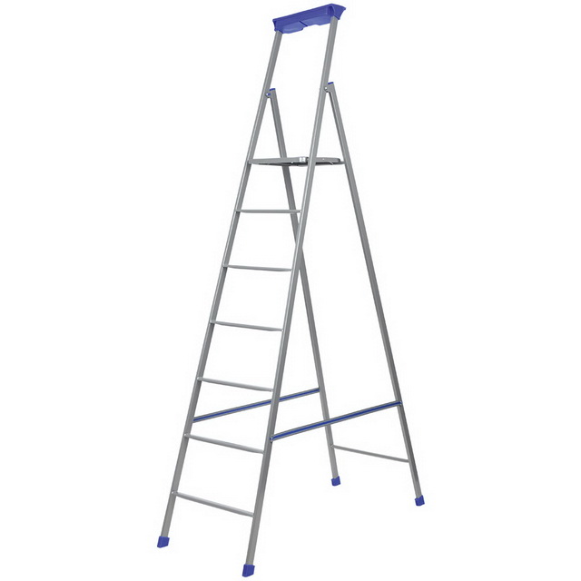 Облегченная металлическая конструкция стремянки с надежным механизмом, для строительно - монтажных работ. Материал: стальные профильные трубы 30х15мм. Высокая удобная дуга безопасности со встроенным лотком для инвентаря и отделением для инструментов. Широкая безопасная площадка со встроенными вставками противоскольжения, рифленой поверхностью и страховочной лентой. Имеется 7 металлических профильных ступеней. Максимальная нагрузка до 100 кг.